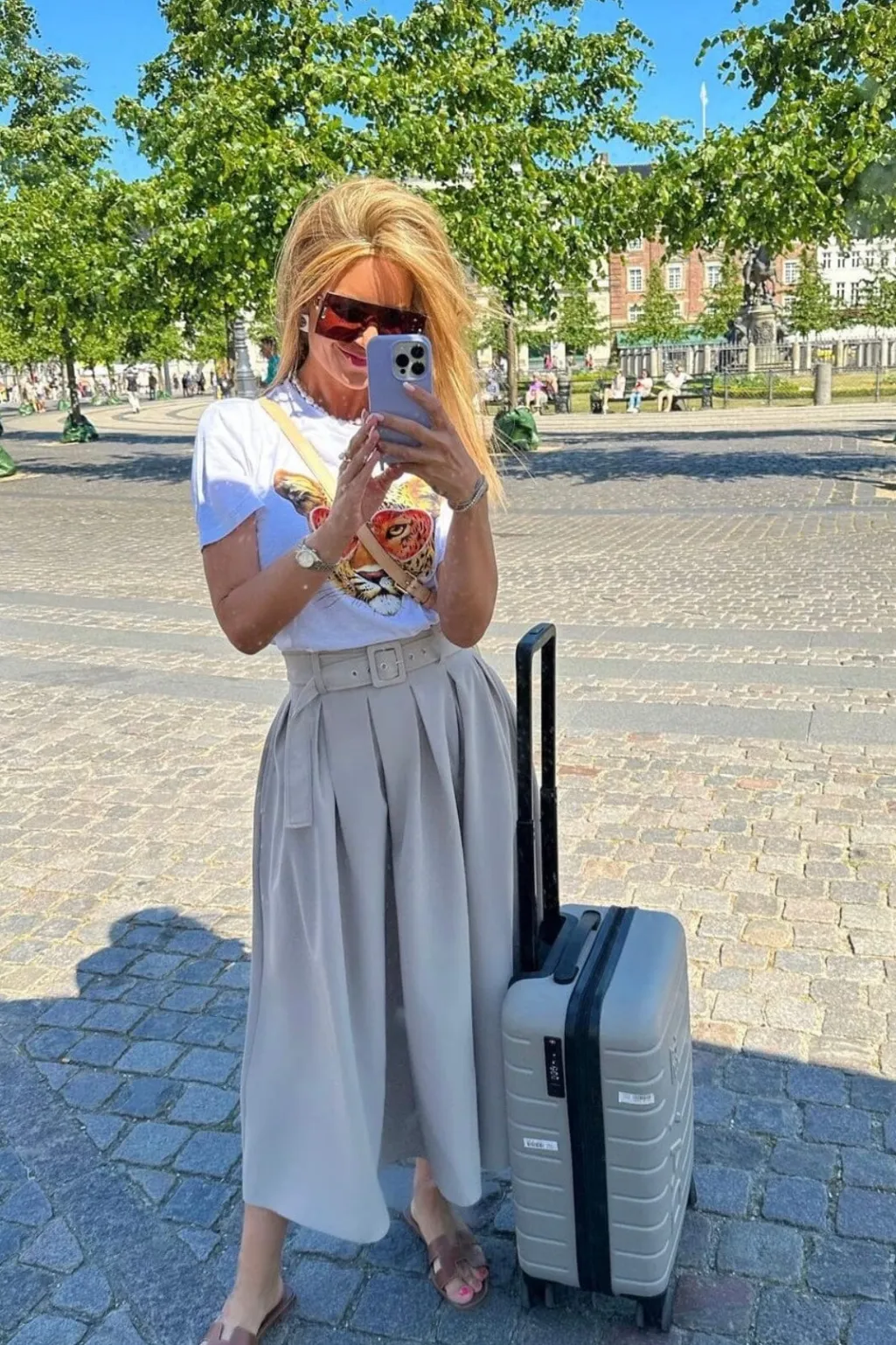Sandfarvet plisseret nederdel fra Valentin Studio med høj talje. Nederdelen har bløde folder, bælte og elastik bagtil samt lommer foran.