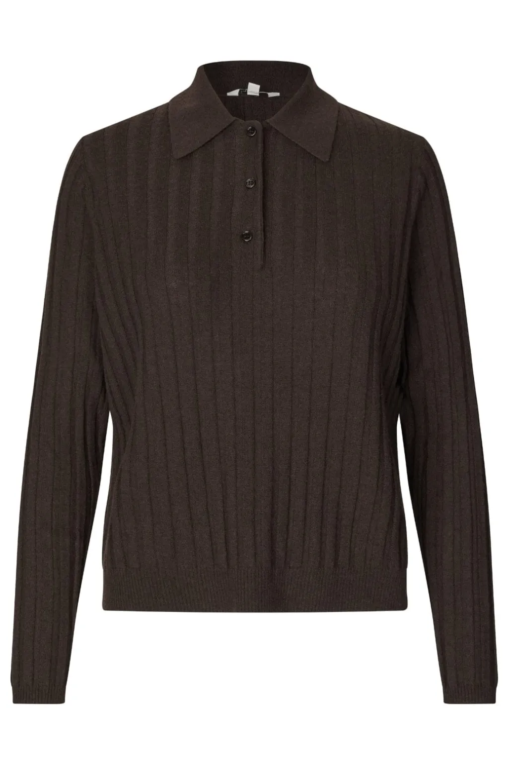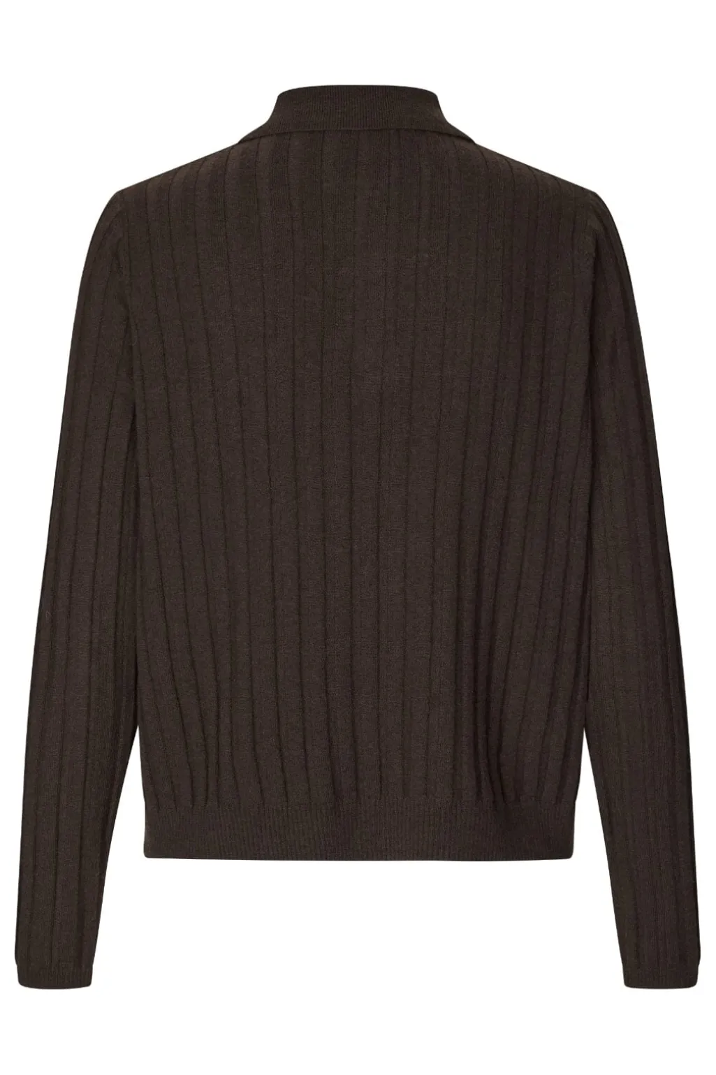 En ribstrikket polo-trøje fra MbyM i en brun Java-nuance. Trøjen har polo-krave med knaplukning og lange ærmer med ribkanter.