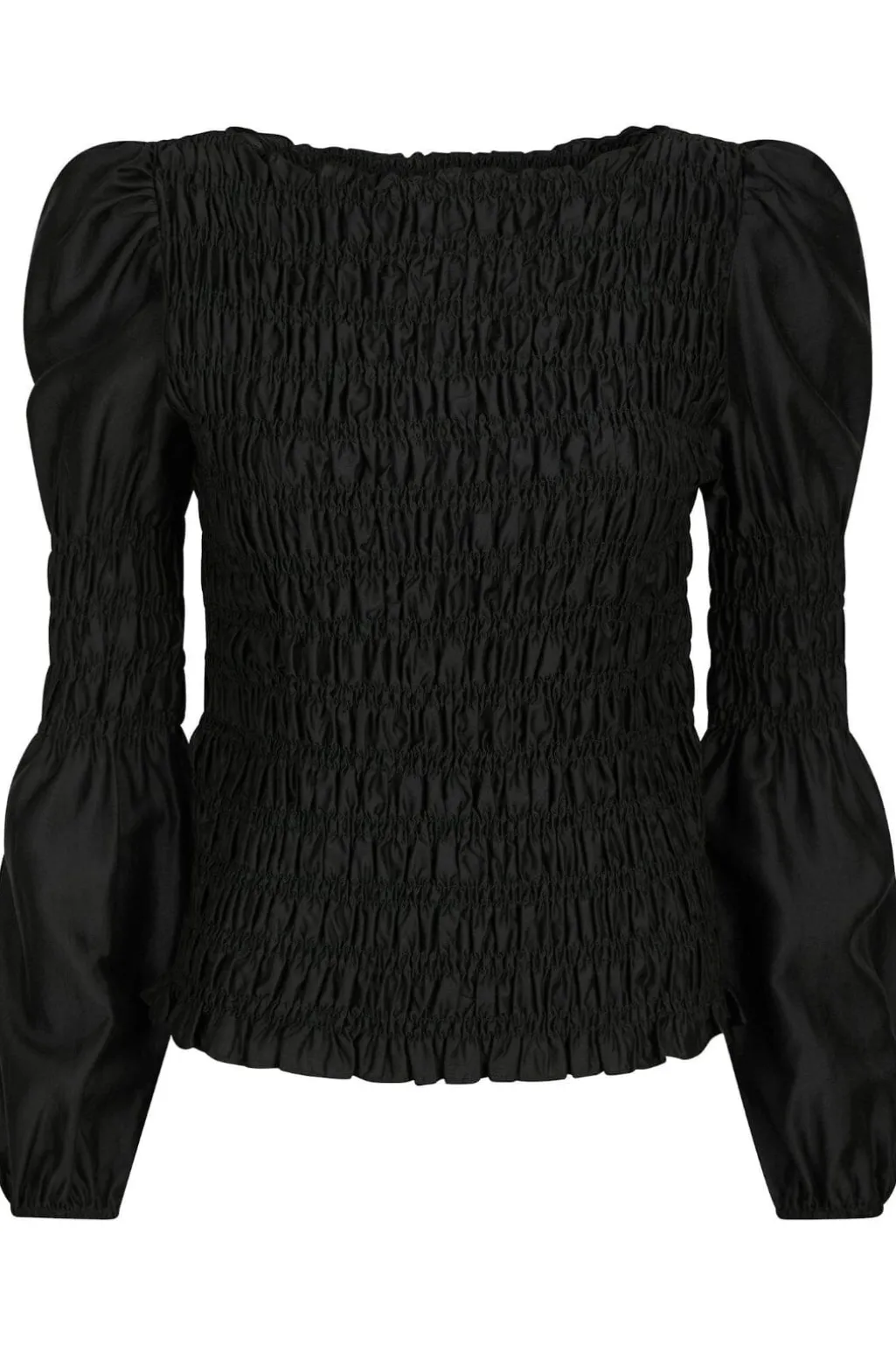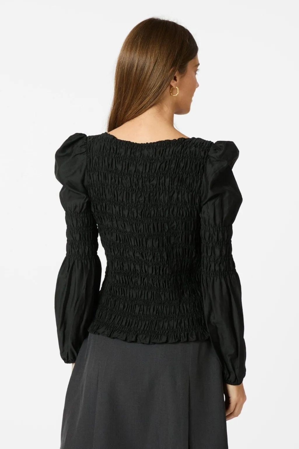 Sort skjorte fra Neo Noir med smock-detaljer over hele stoffet. Den firkantede halsudskæring og de puffede ærmer skaber en karakteristisk silhuet med tekstur og volumen.