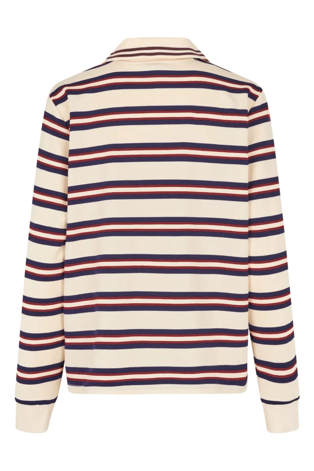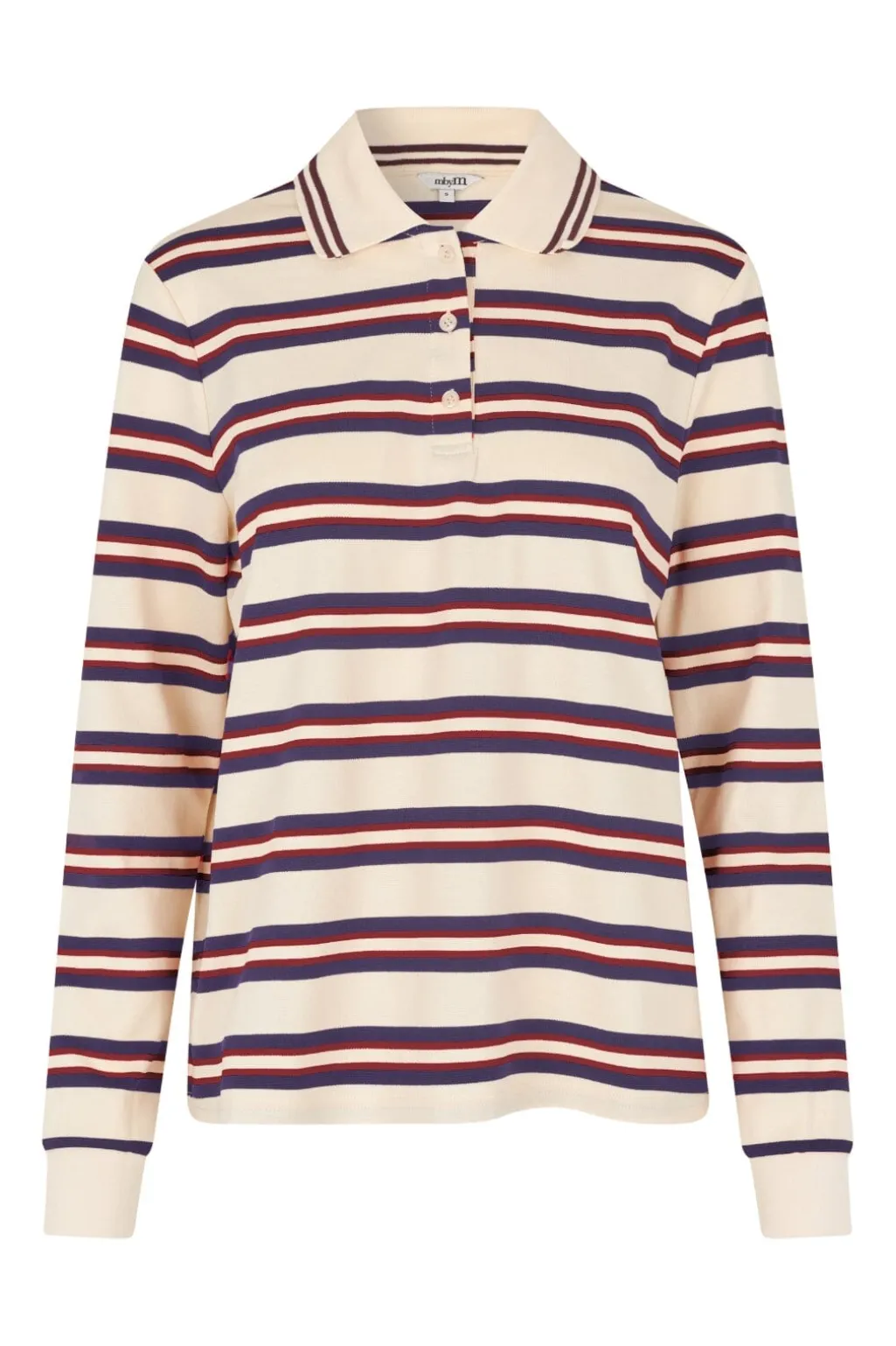 Stribet polobluse fra MbyM med vandrette striber i navy, bordeaux og creme. Den har en klassisk polokrave og lange ærmer med manchetter.