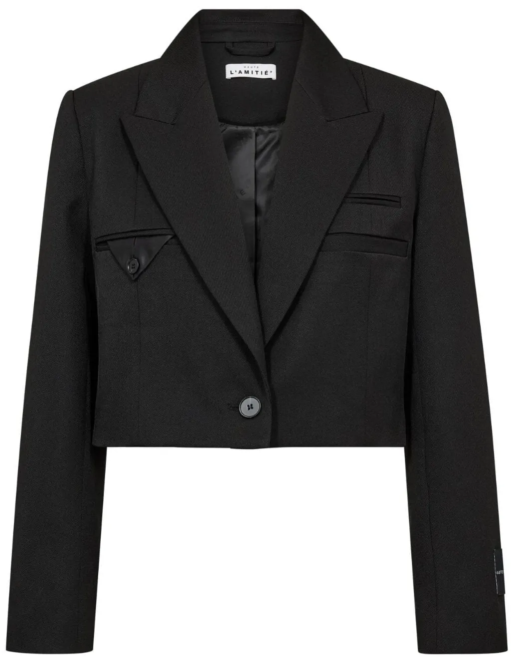 Sort cropped blazer fra Haute L’Amitié med skjortekrave og enkelt knaplukning. Blazeren har lange ærmer og to flaplommer foran.