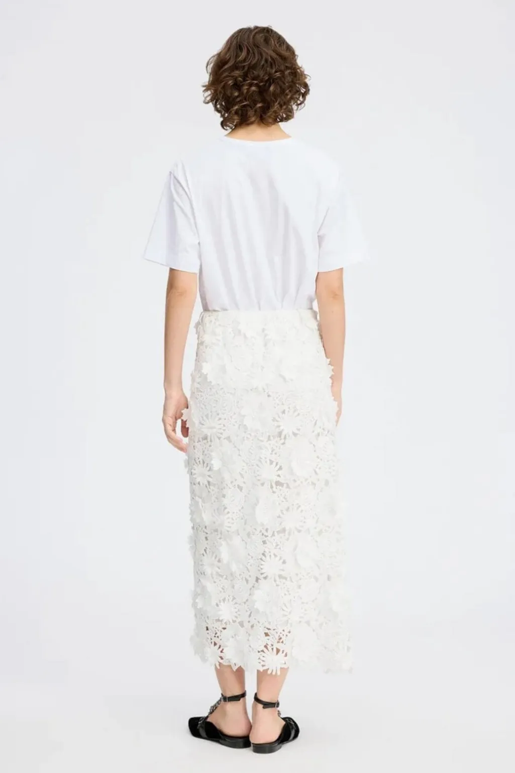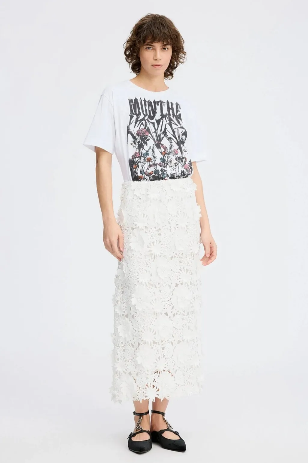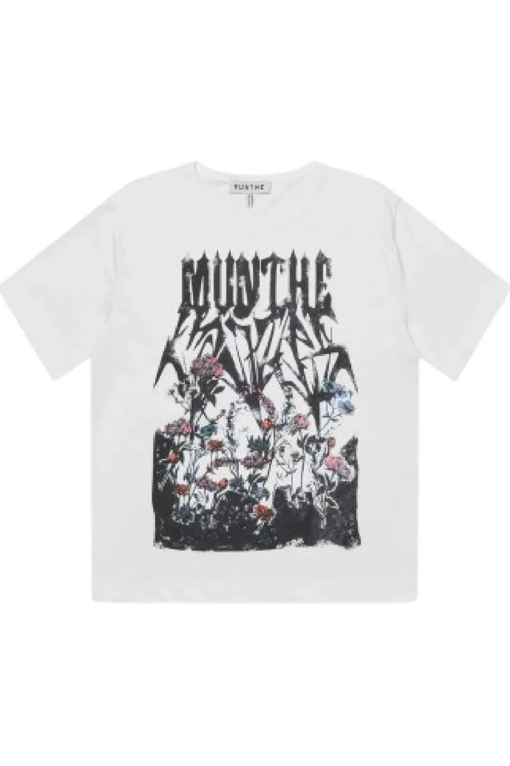 Hvid t-shirt fra Munthe med et grafisk design. Det kunstneriske print kombinerer MUNTHE-logoet med blomstermotiver i flere farver på den hvide baggrund.