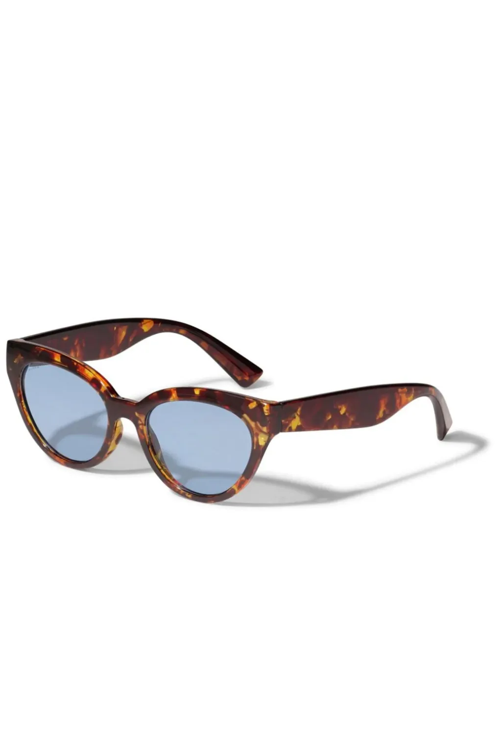 Solbriller fra Pilgrim med brunt skildpaddemønstret stel og lyseblå linser. Stellet har en cat-eye-form og er udstyret med UVA/UVB-beskyttelse samt UV400-beskyttede linser.