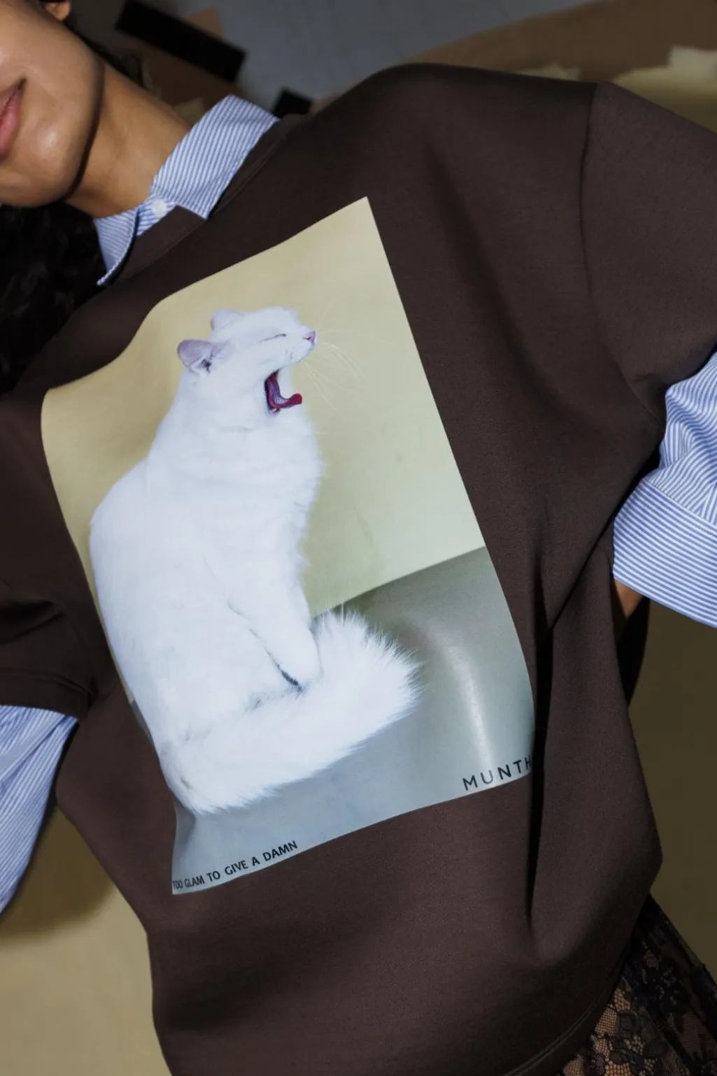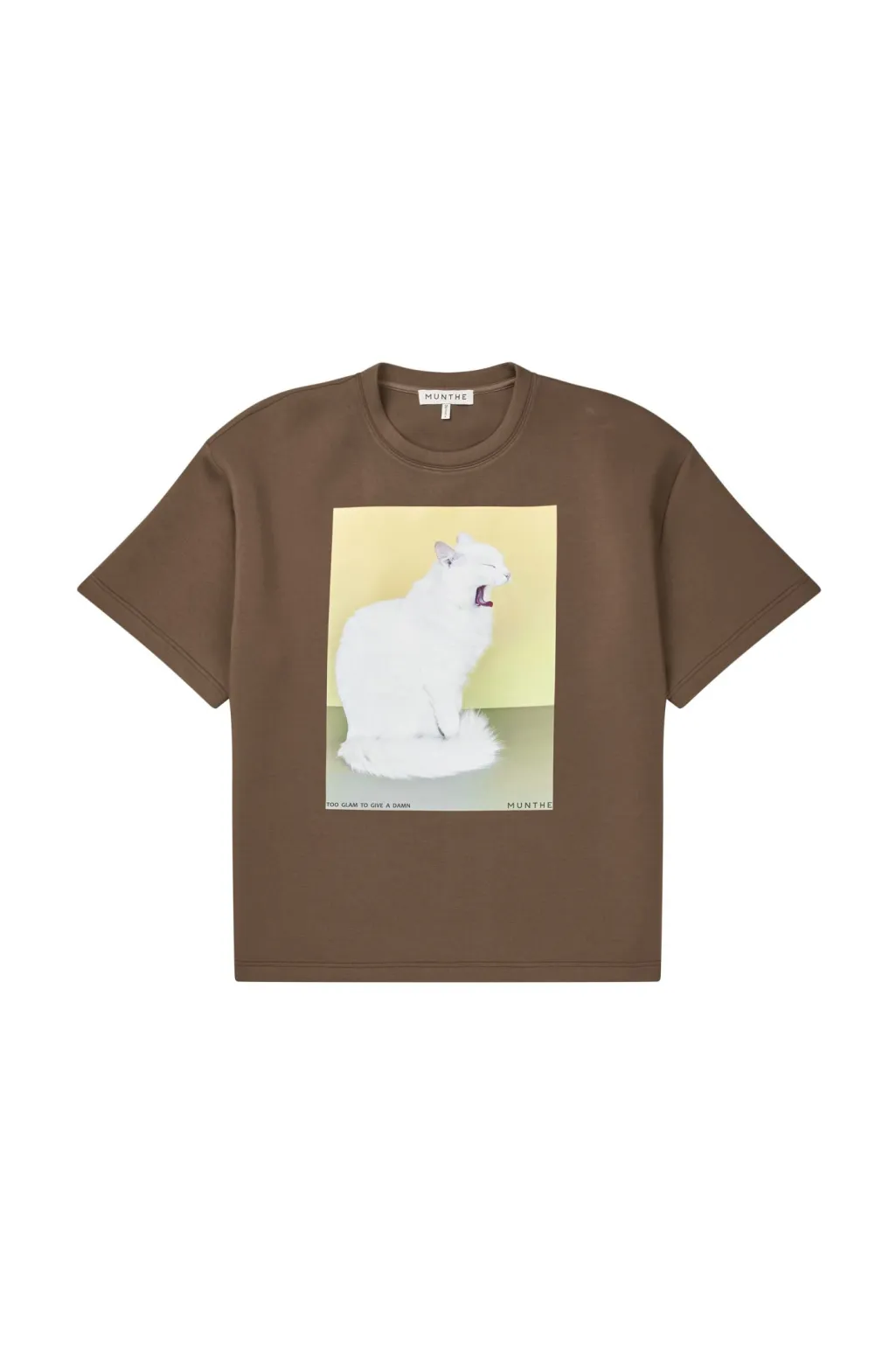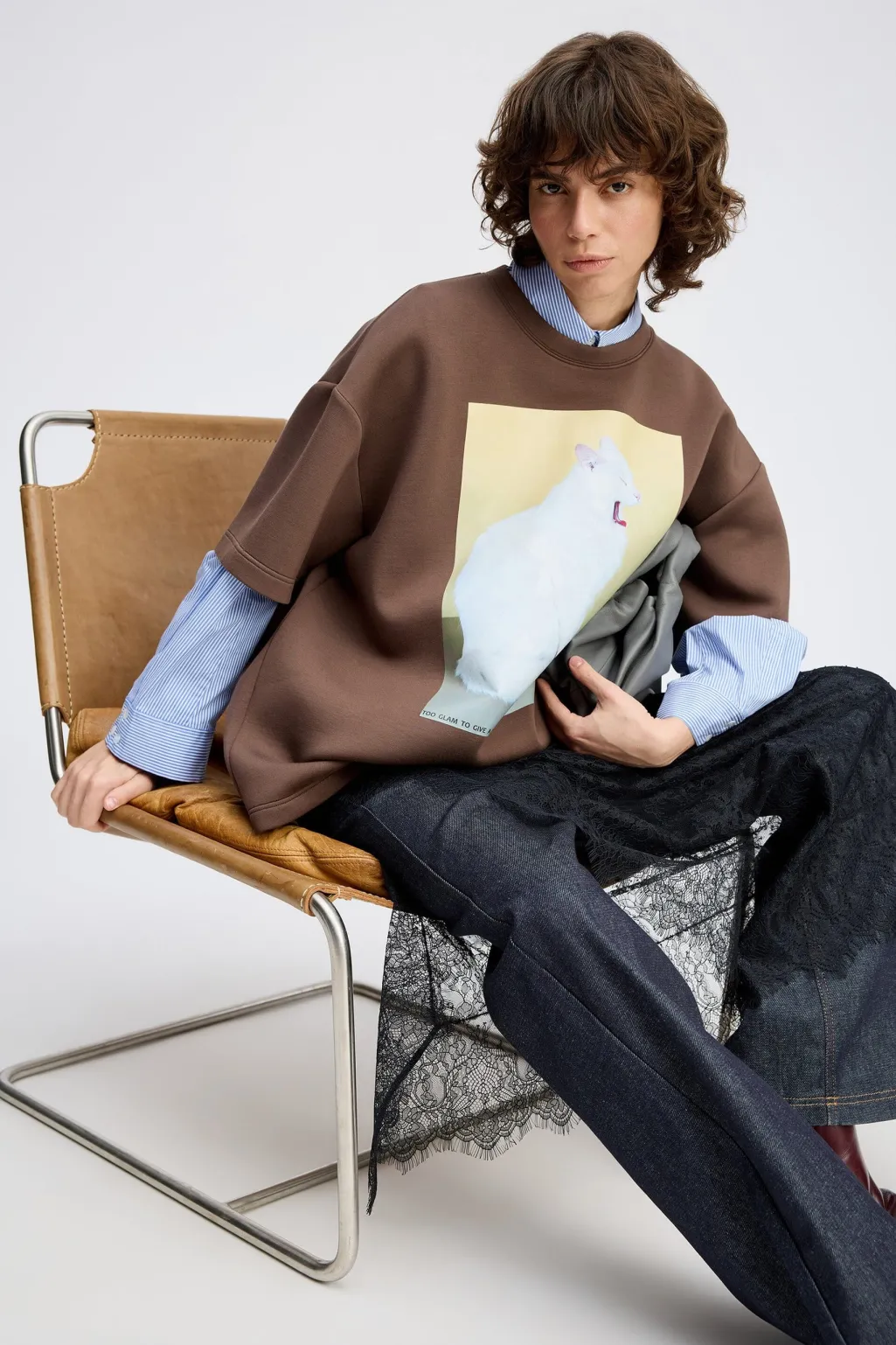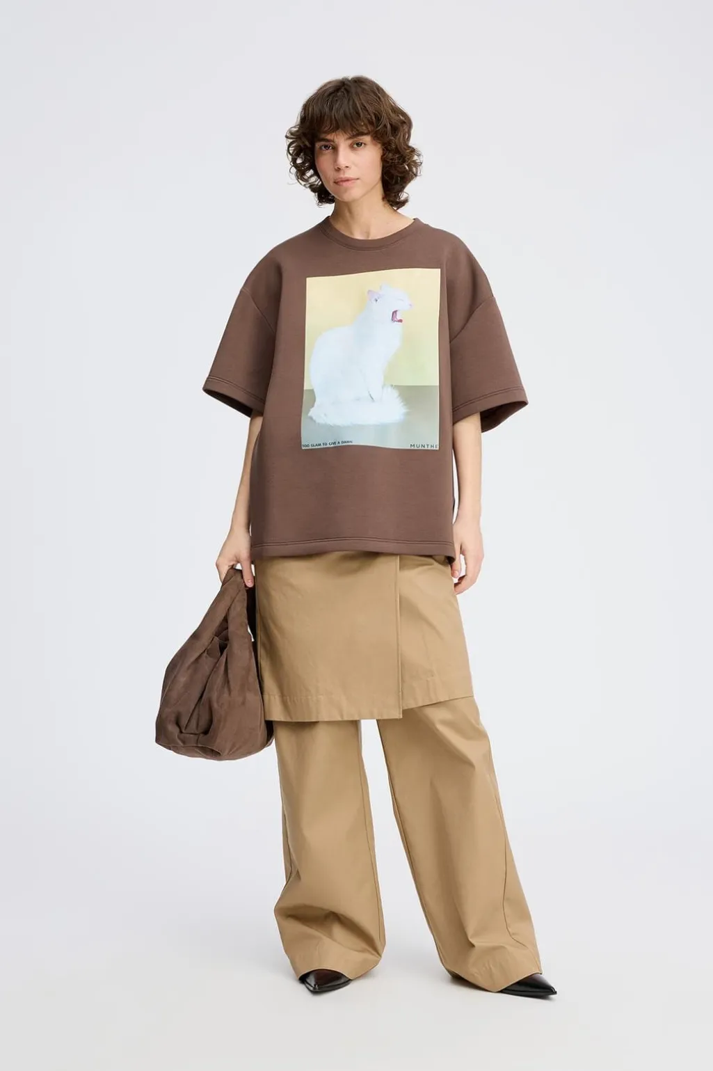 Brun bluse fra Munthe med et printdesign. Blusen har en oversize pasform og rund halsudskæring, der gør den nem at tage på og af.
