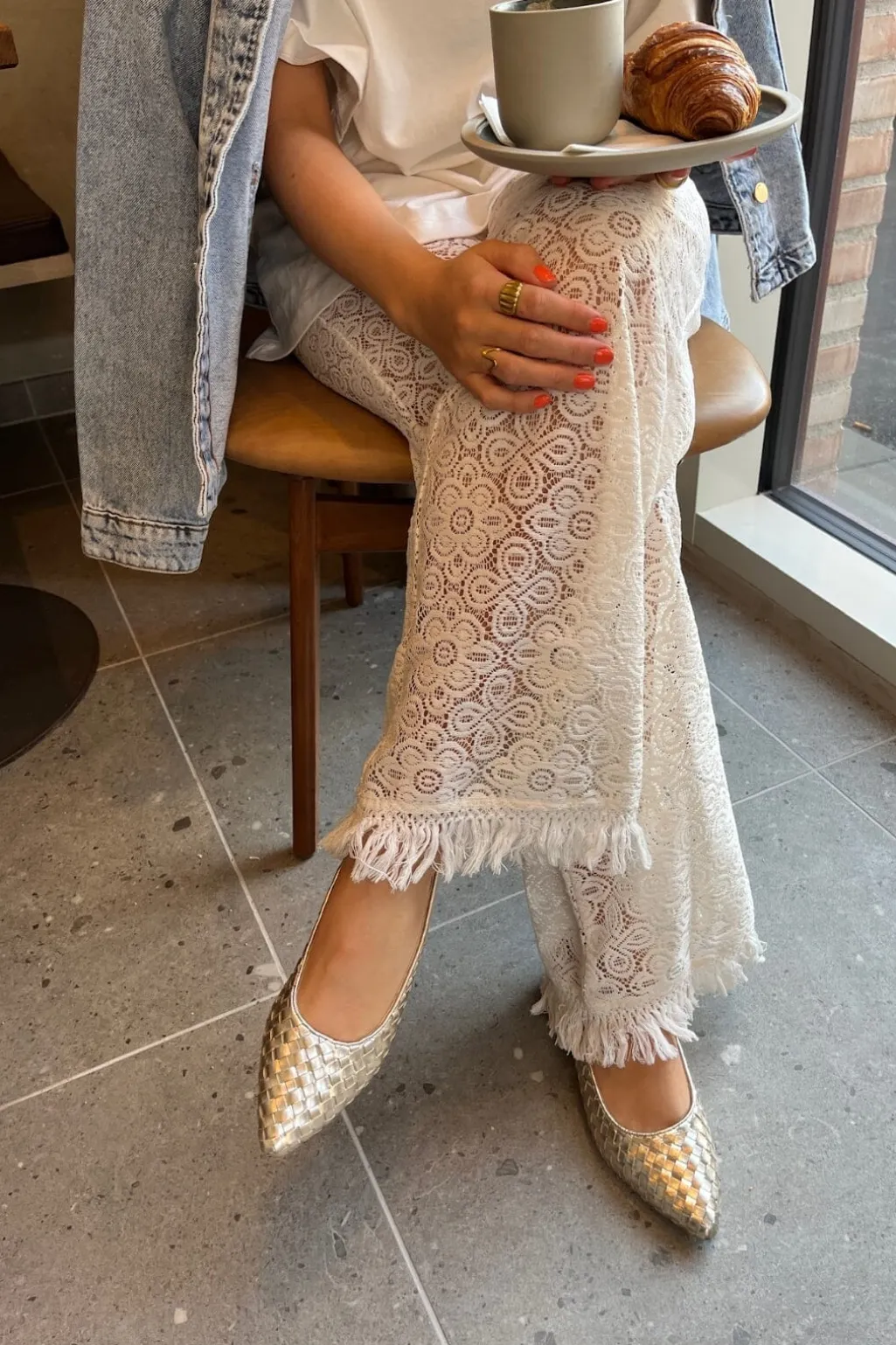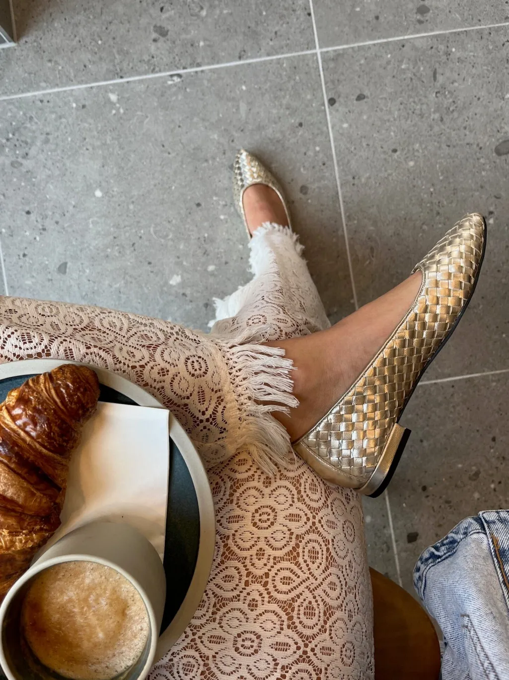 Ballerina-sko fra Copenhagen Shoes i flettet læder med platinfarvet overflade. Skoene har spidse snuder og er foret med læder indvendigt. Indersålen kombinerer læder med skum for god støtte.
