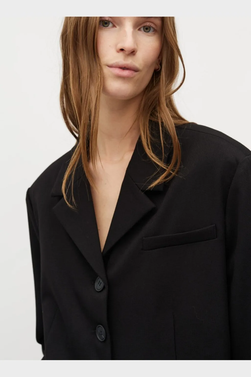 Sort blazer fra MbyM med klassisk design. Blazeren har fire knapper foran, to lommer og en traditionel krave med revers.