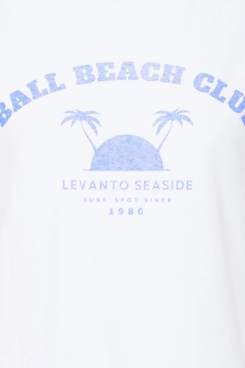 Hvid t-shirt fra Ball med blå striber og maritim grafik. Det grafiske tryk viser Ball Beach Club og Levanto Seaside på forsiden, kombineret med palmer og maritime detaljer.