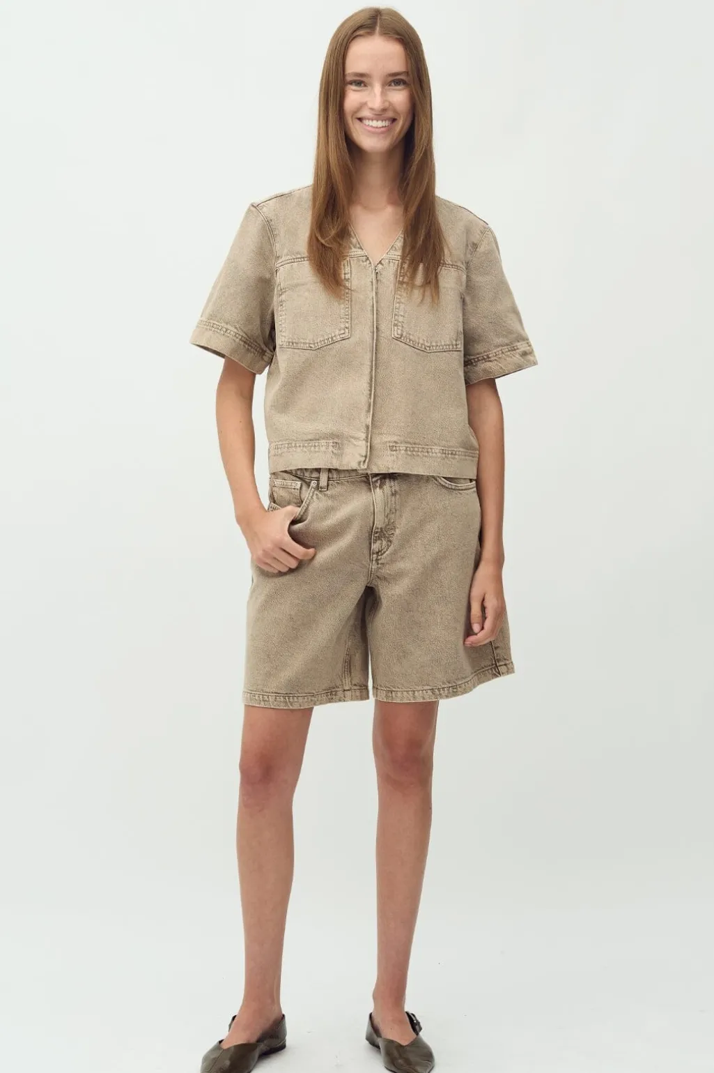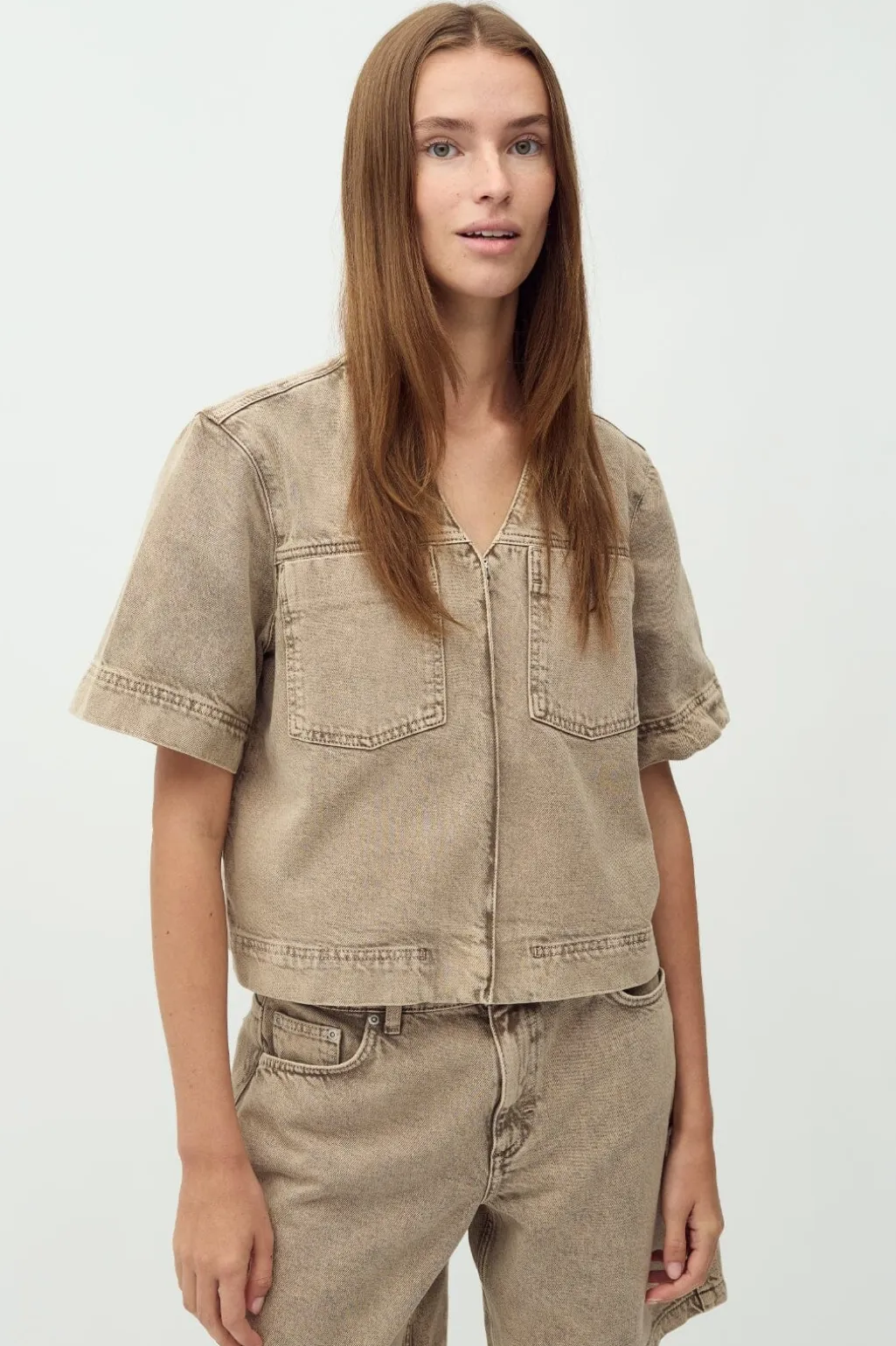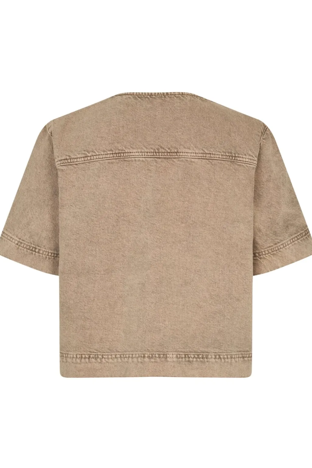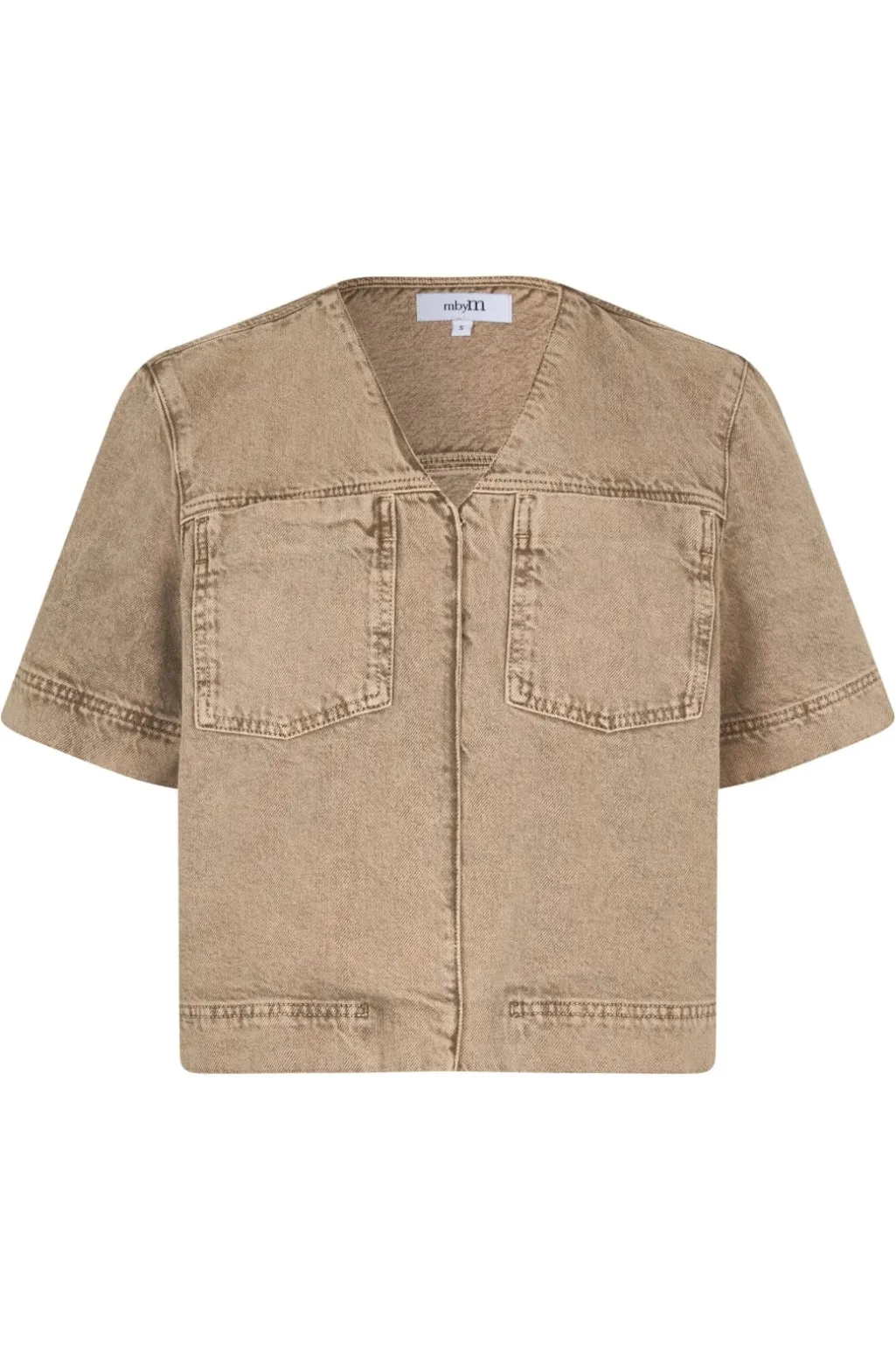 Beige denimskjorte fra MbyM med cropped design. Skjorten har en V-halsudskæring og to brystlommer, kombineret med korte ærmer og dekorative syninger.