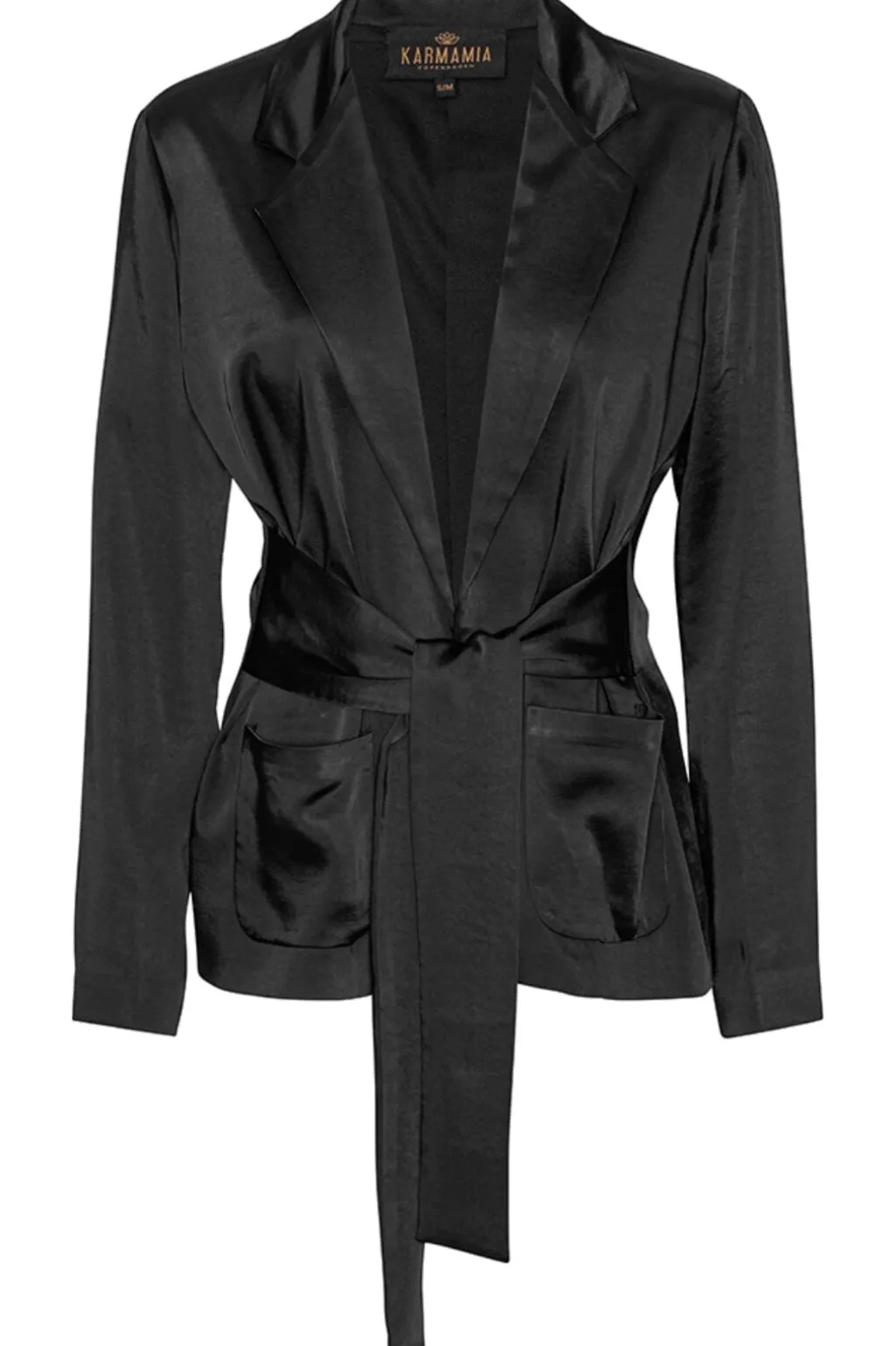 Sort blazer fra Karmamia i kraftig satin med foer. Blazeren har et påsyet bælte, der kan bindes både foran og bagpå, samt to forlommer og reverskrave.