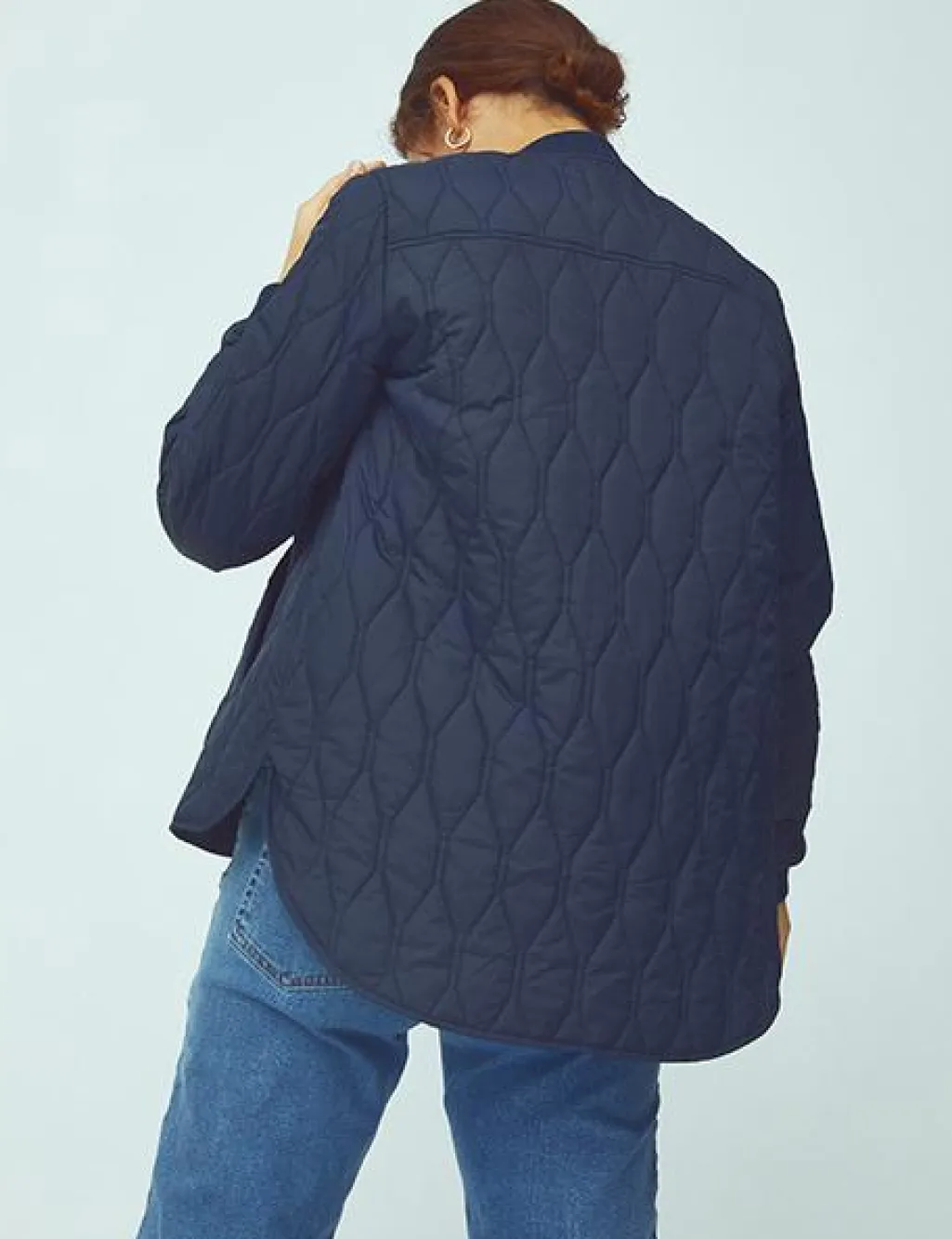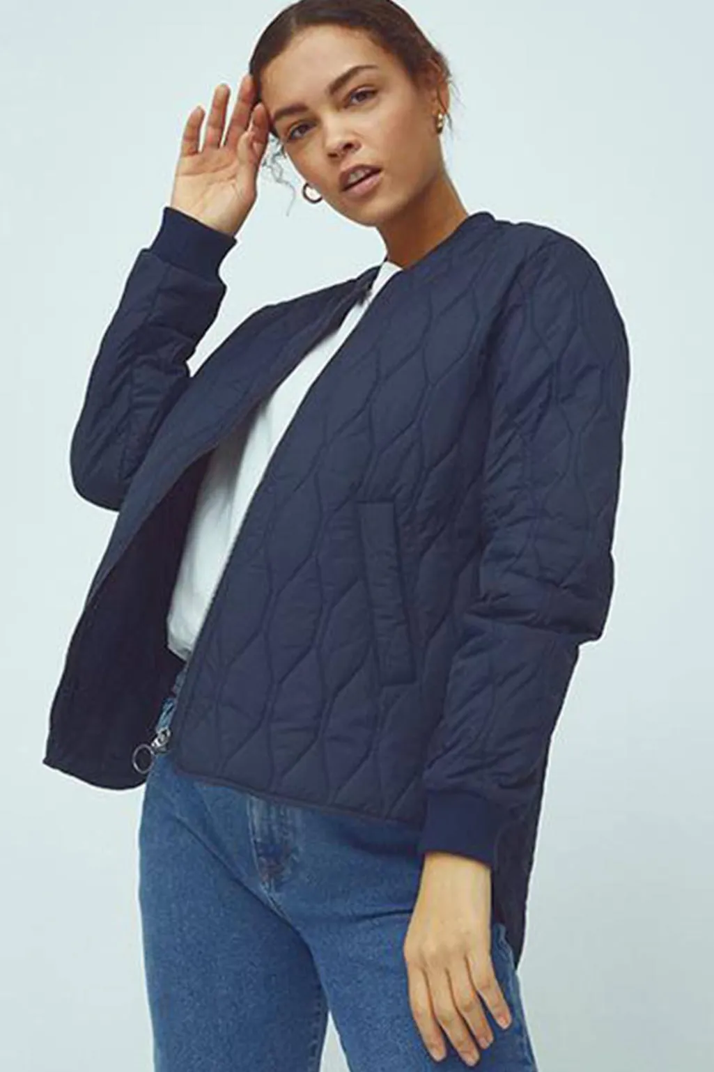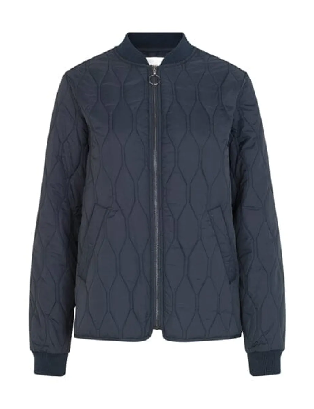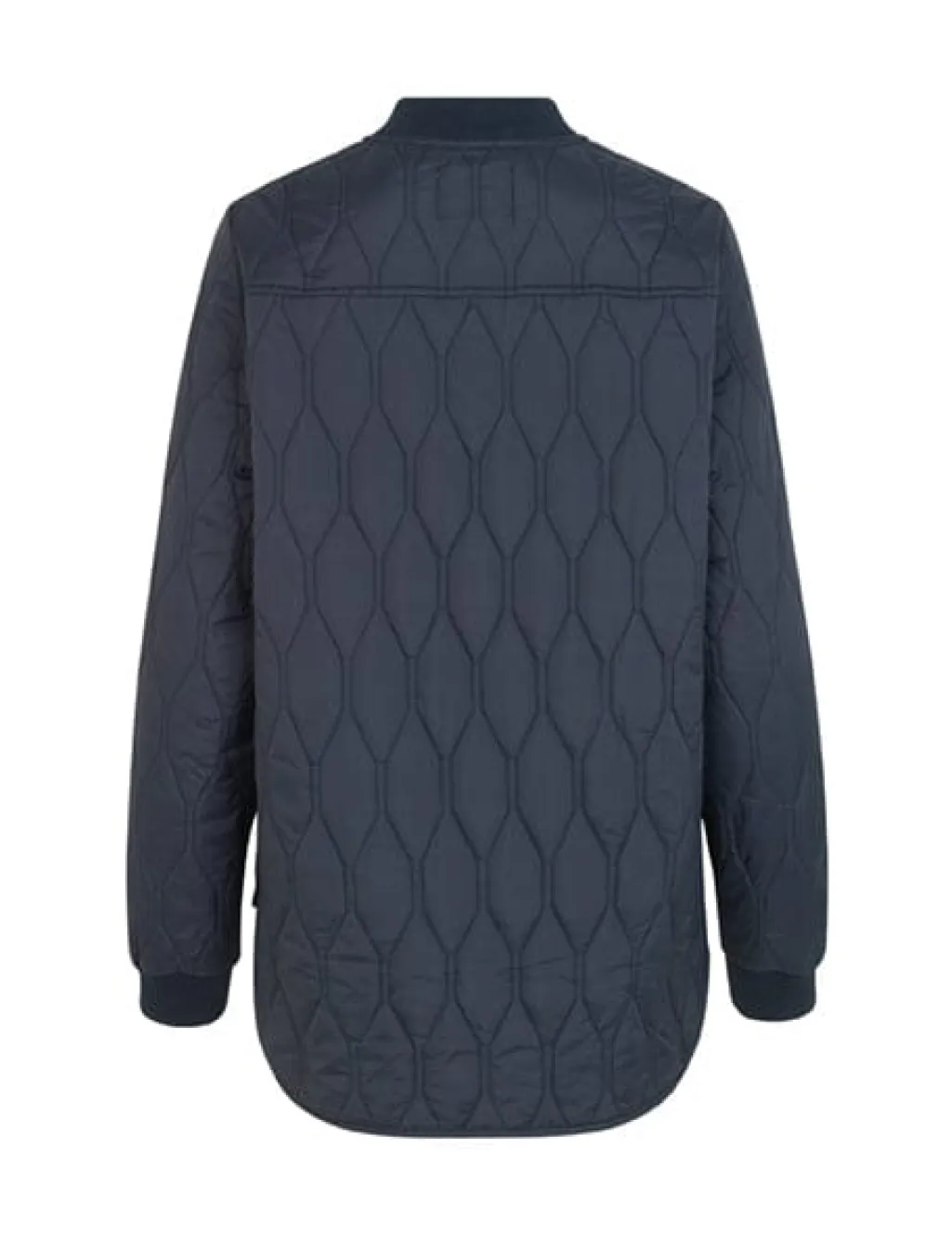 Kort termojakke fra Global Funk i mørkeblå. Jakken har quiltet design med diamantmønster, ribkanter ved ærmerne og halsen samt lynlås lukning foran.