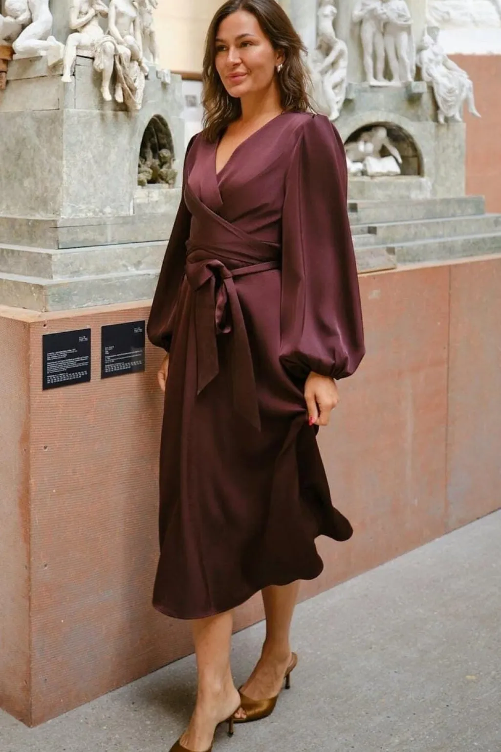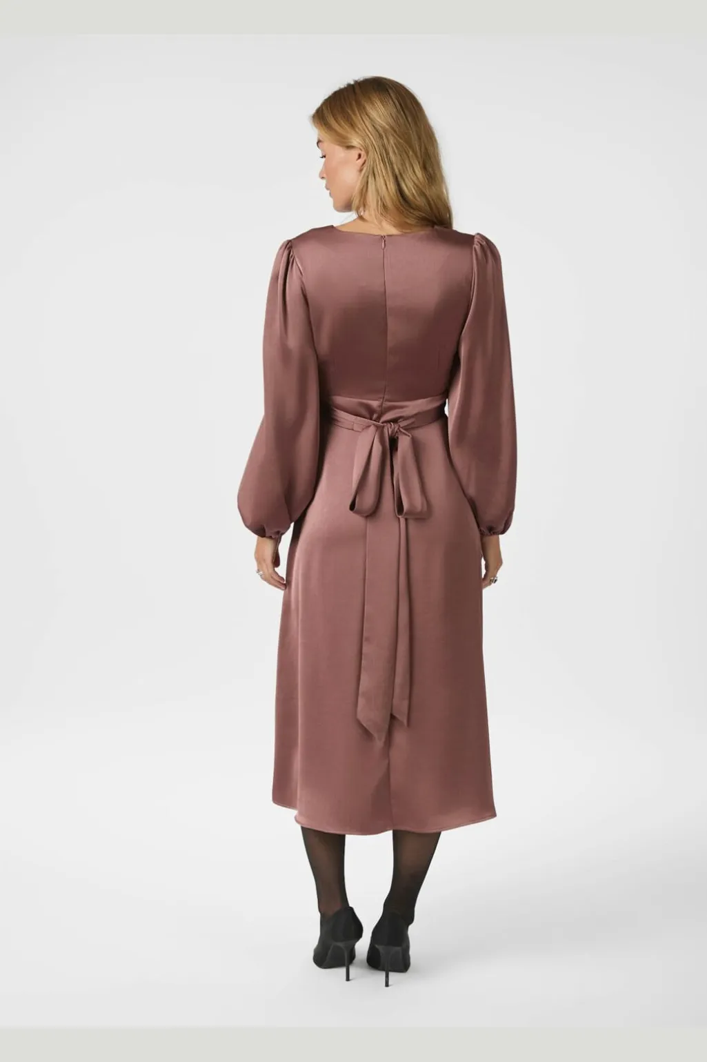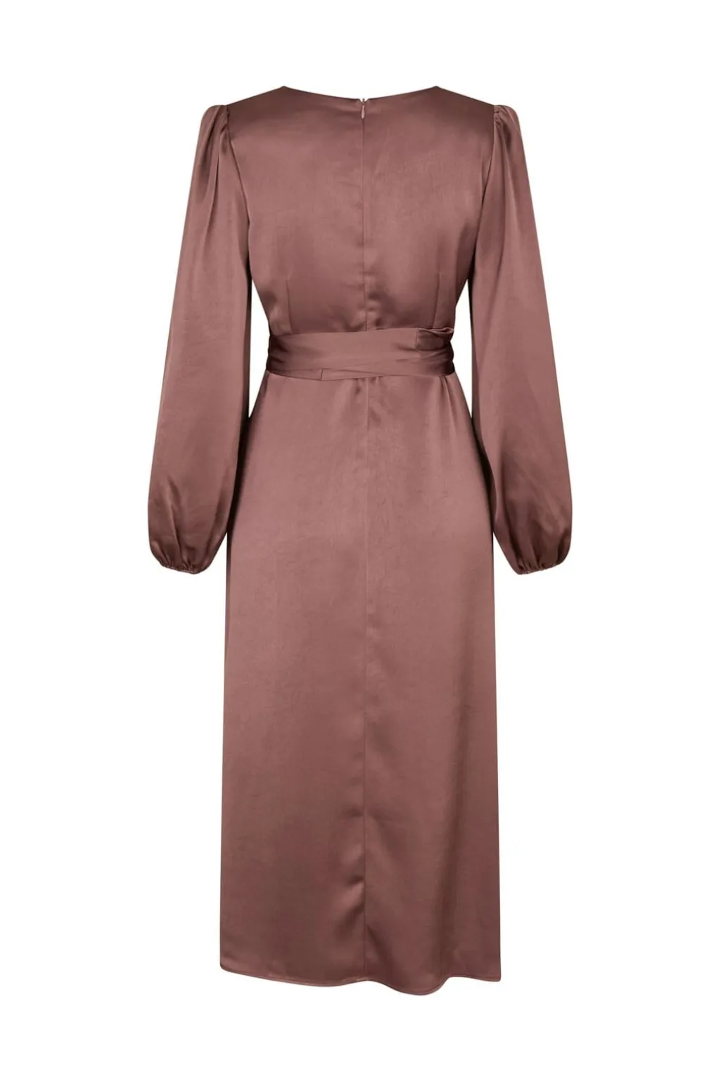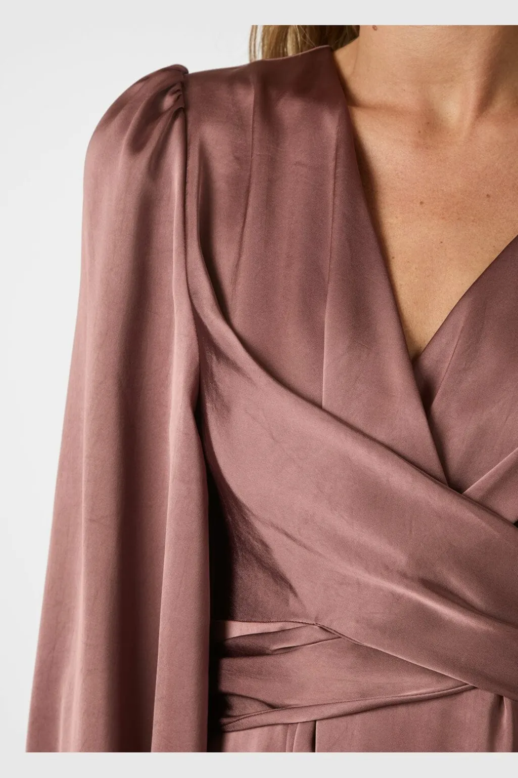Satin kjole fra Neo Noir i mørk rosa. Kjolen har en V-udskæring, lange ærmer med samlede håndled og et slå-om-design med bindebånd i taljen.
