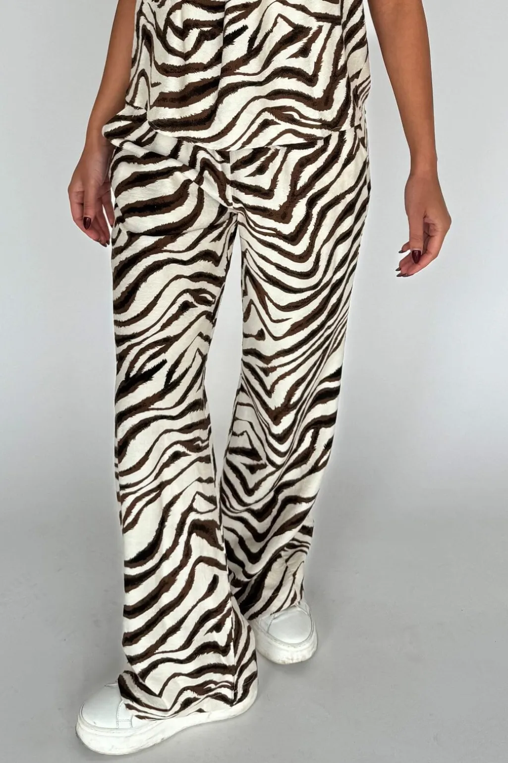 Bukser fra Continue med zebramønster i brune og hvide nuancer. De lange bukser har en afslappet pasform og rynkede detaljer ved anklerne.