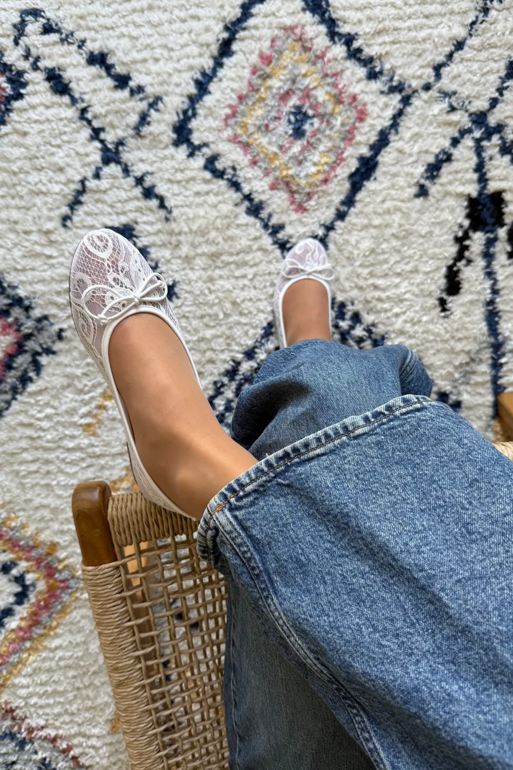 Hvide ballerinasko fra Bloom med blondedetaljer og sløjfe. Skoene har rund tå og lav hæl, der gør dem nemme at bruge til festlige anledninger som bryllupper og andre fejringer.