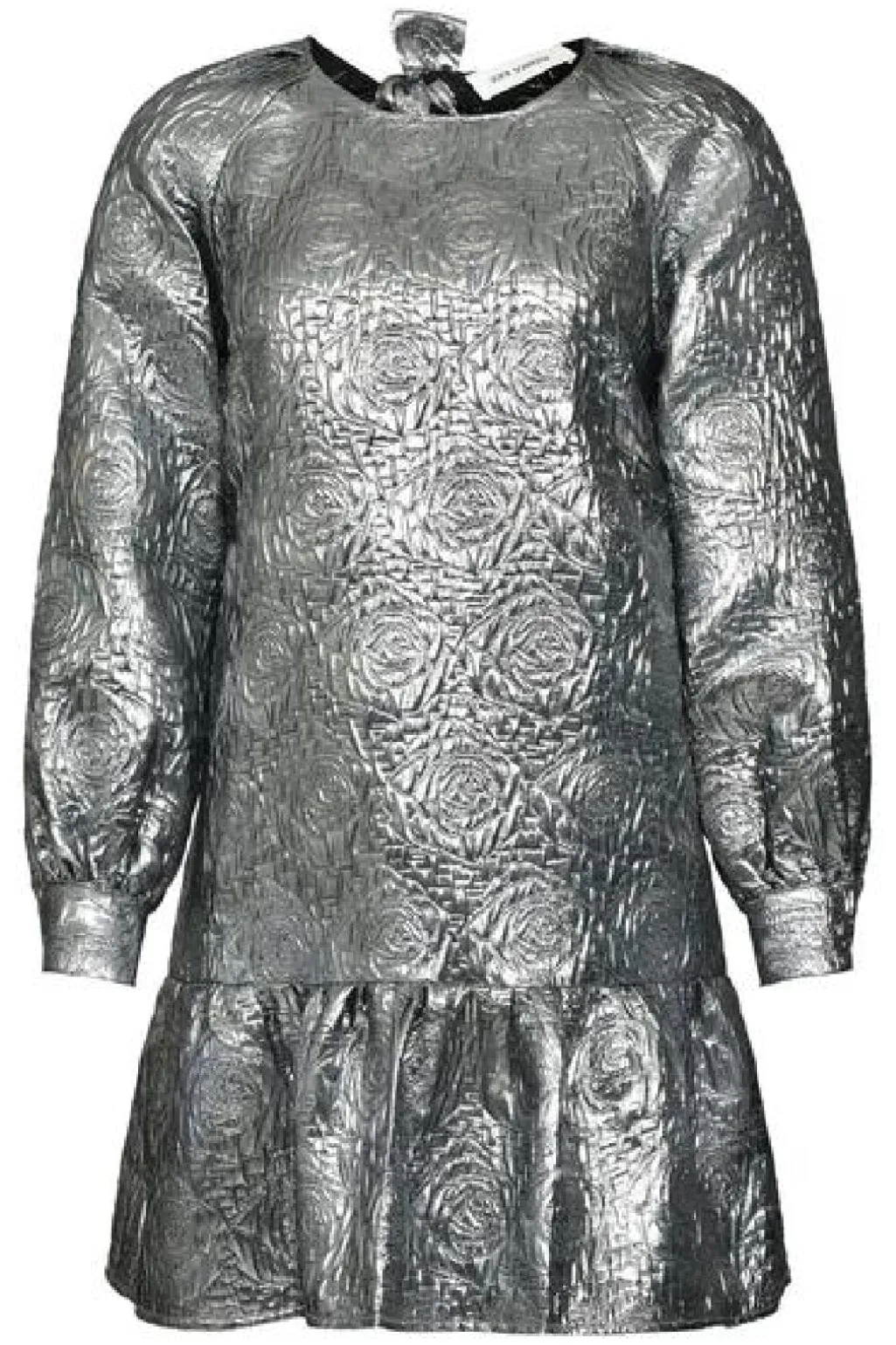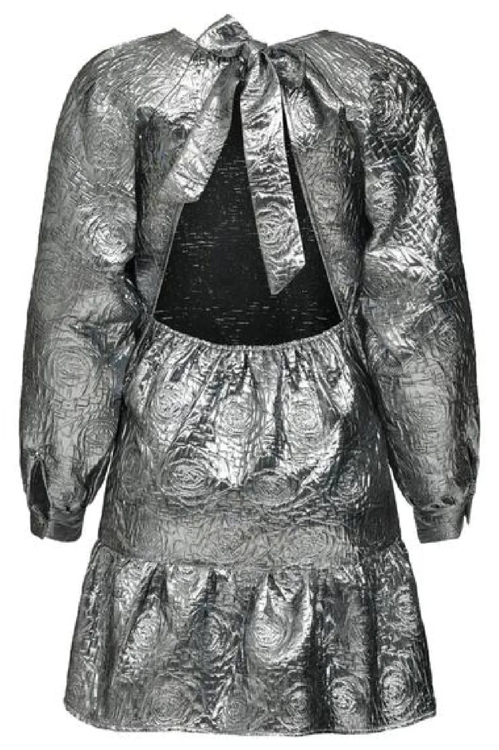 Kort kjole fra Sofie Schnoor i sølvfarvet stof med blomstermønster. Kjolen har puffede ærmer og rund hals med stor sløjfe i nakken. Den åbne ryg og peplumkant i bunden giver kjolen et festligt præg.