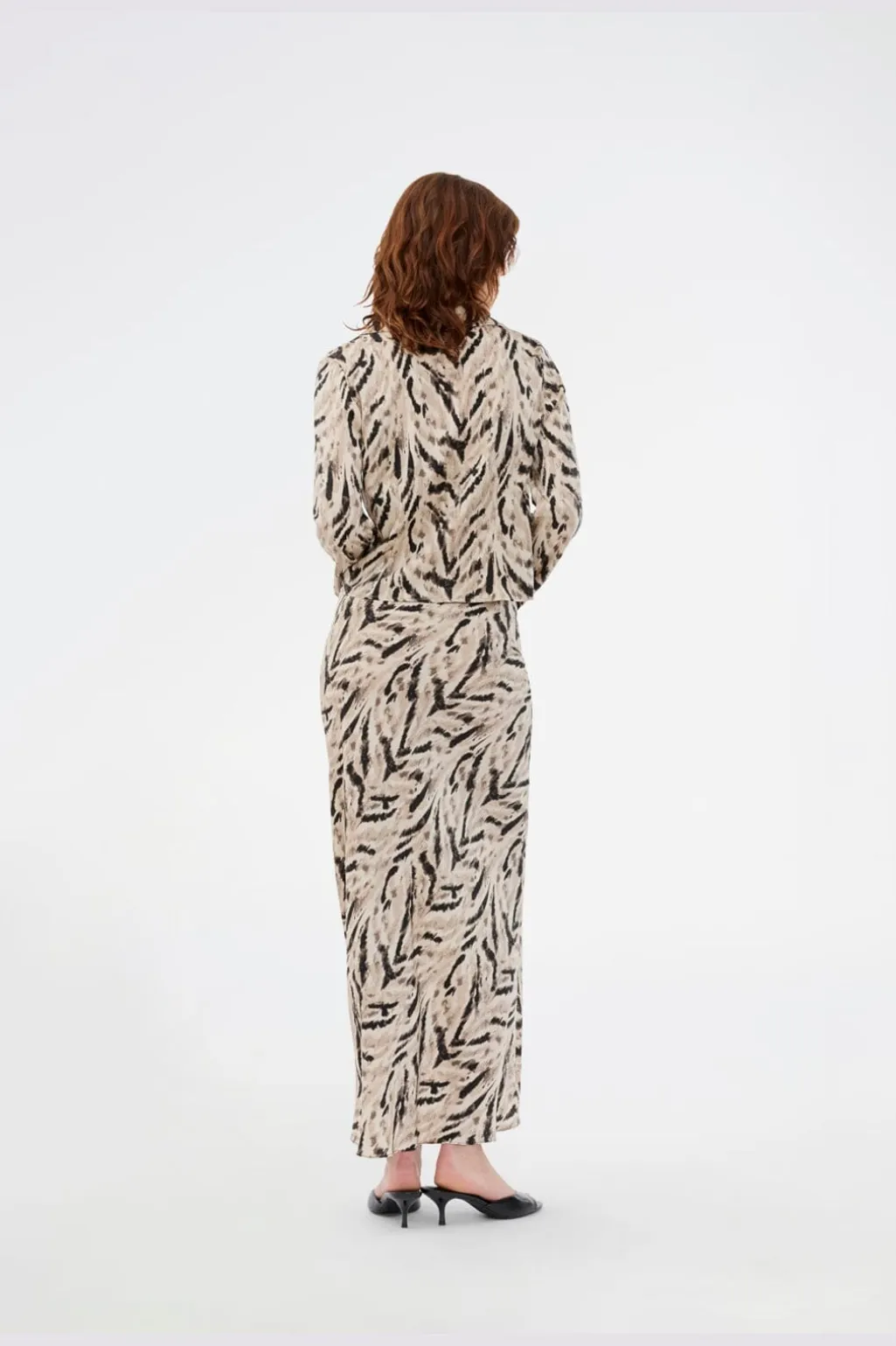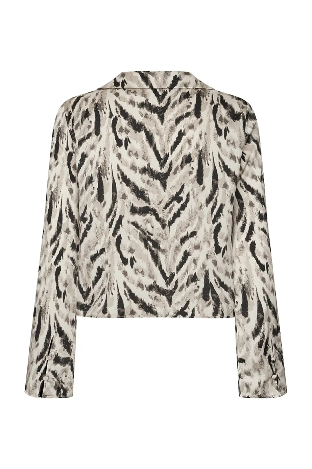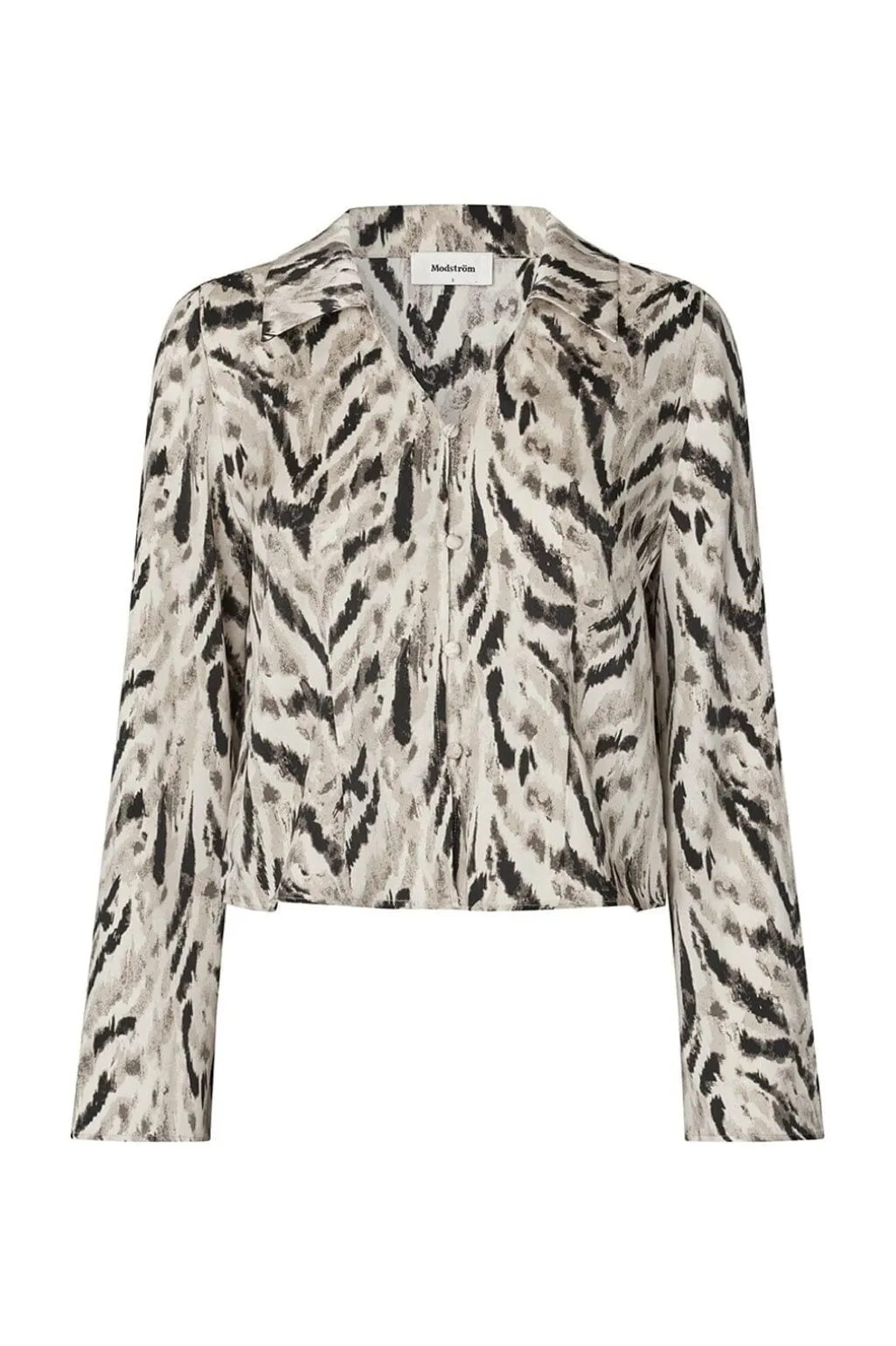 Skjorte fra Modström i et sort-hvidt dyreprint med beige nuancer. Den har en klassisk skjortekrave og lange ærmer med knaplukning foran.