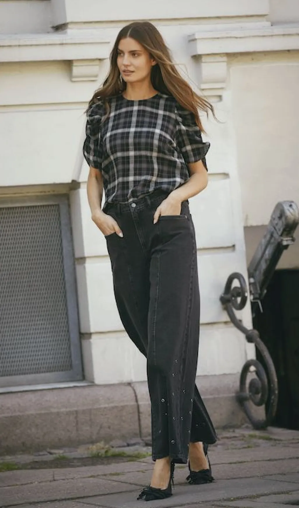 Ternet bluse fra Co´Couture i sort og grå. Blusen har pufærmer og en rund halsudskæring med knaplukning bagpå. Det ternede mønster skaber et grafisk udtryk.
