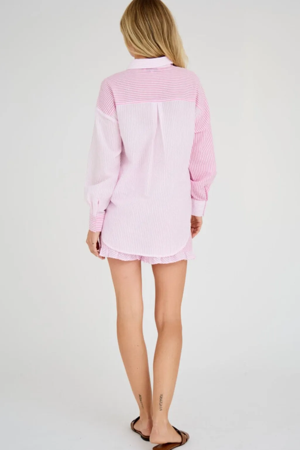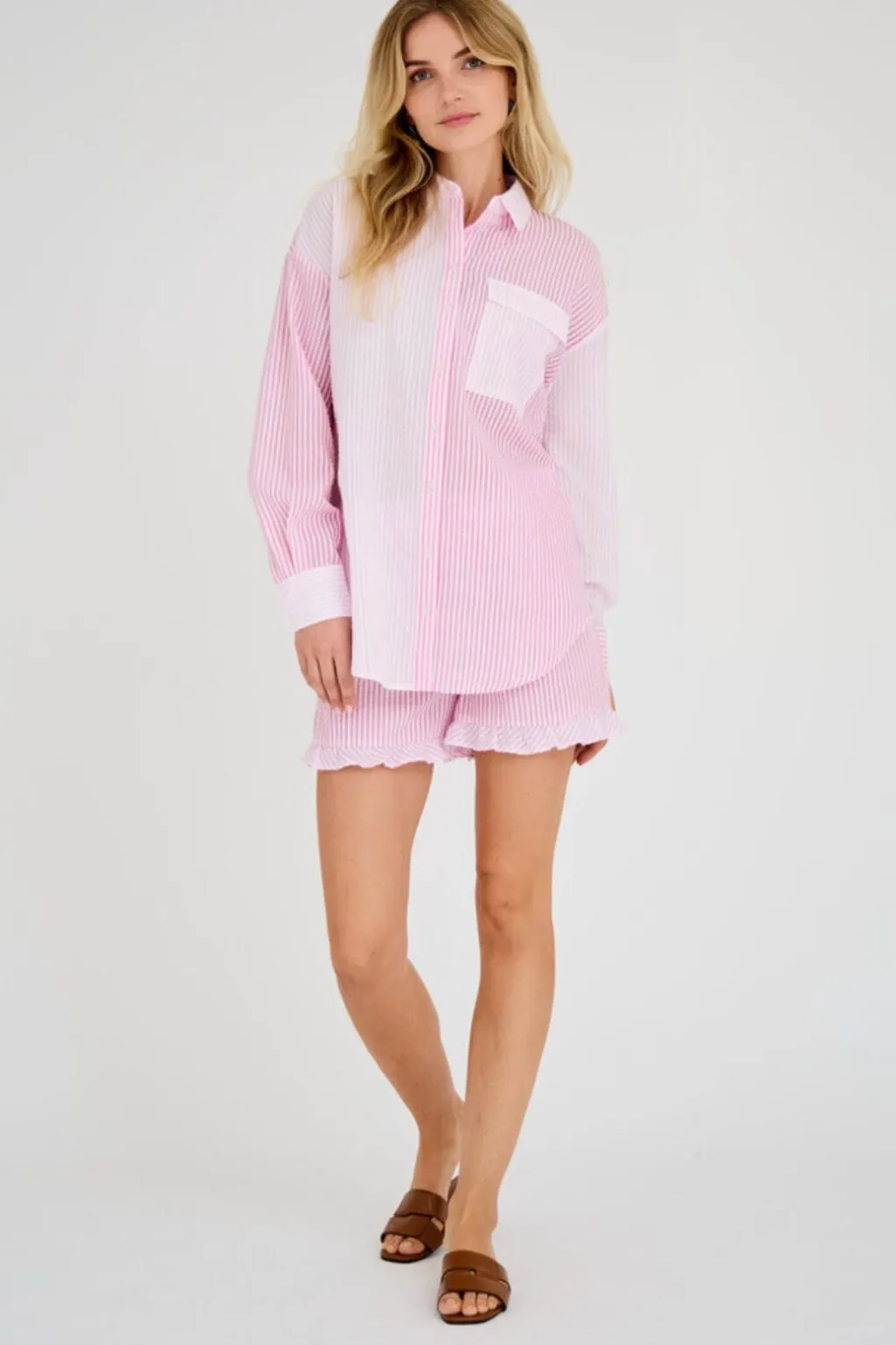 Stribede shorts fra A-View i rose/pink med hvide striber. De har bølgede kanter og en afslappet stil, der passer godt til hjemmebrug.
