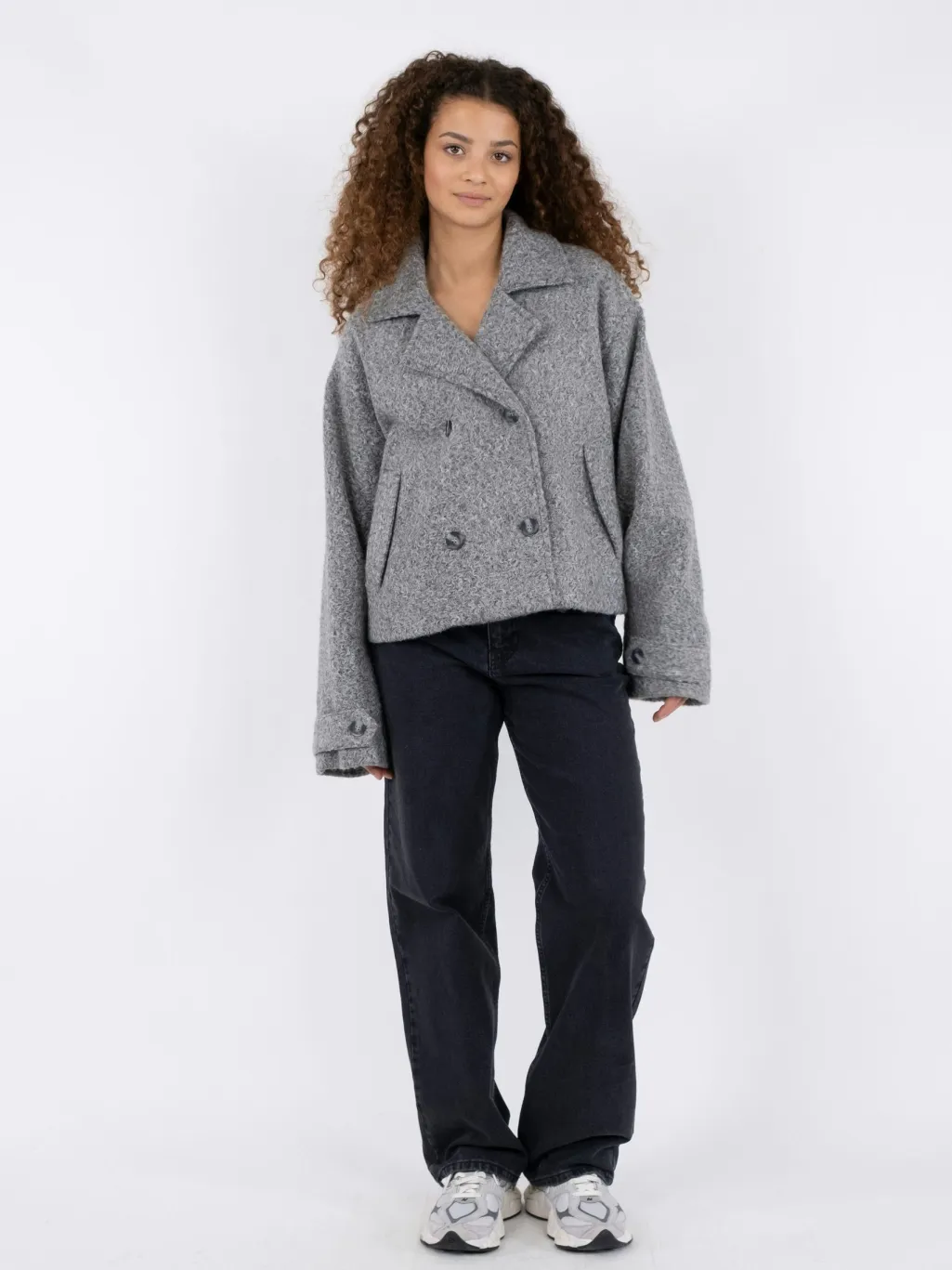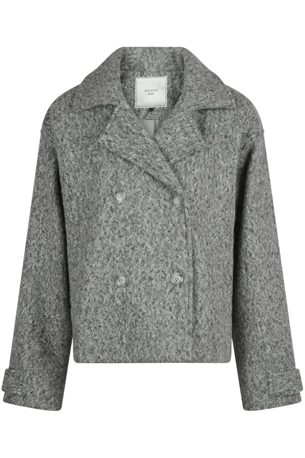 Grå jakke fra Neo Noir i meleret nylon. En kort jakke med Peter Pan-krave og dobbeltbrystet design med knapper. Den boxy silhuet giver god plads til lag-på-lag.