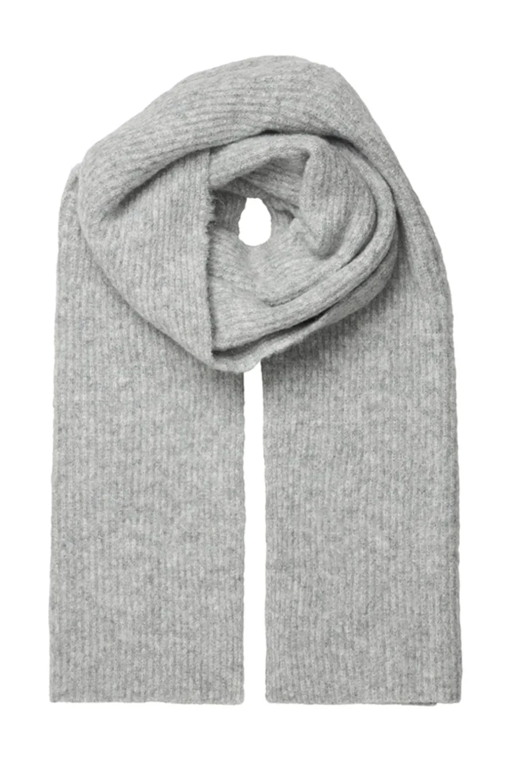 Lysegrå tørklæde fra MbyM med en ribbet tekstur gennem hele stoffet. Tørklædet er ensfarvet uden mønstre.