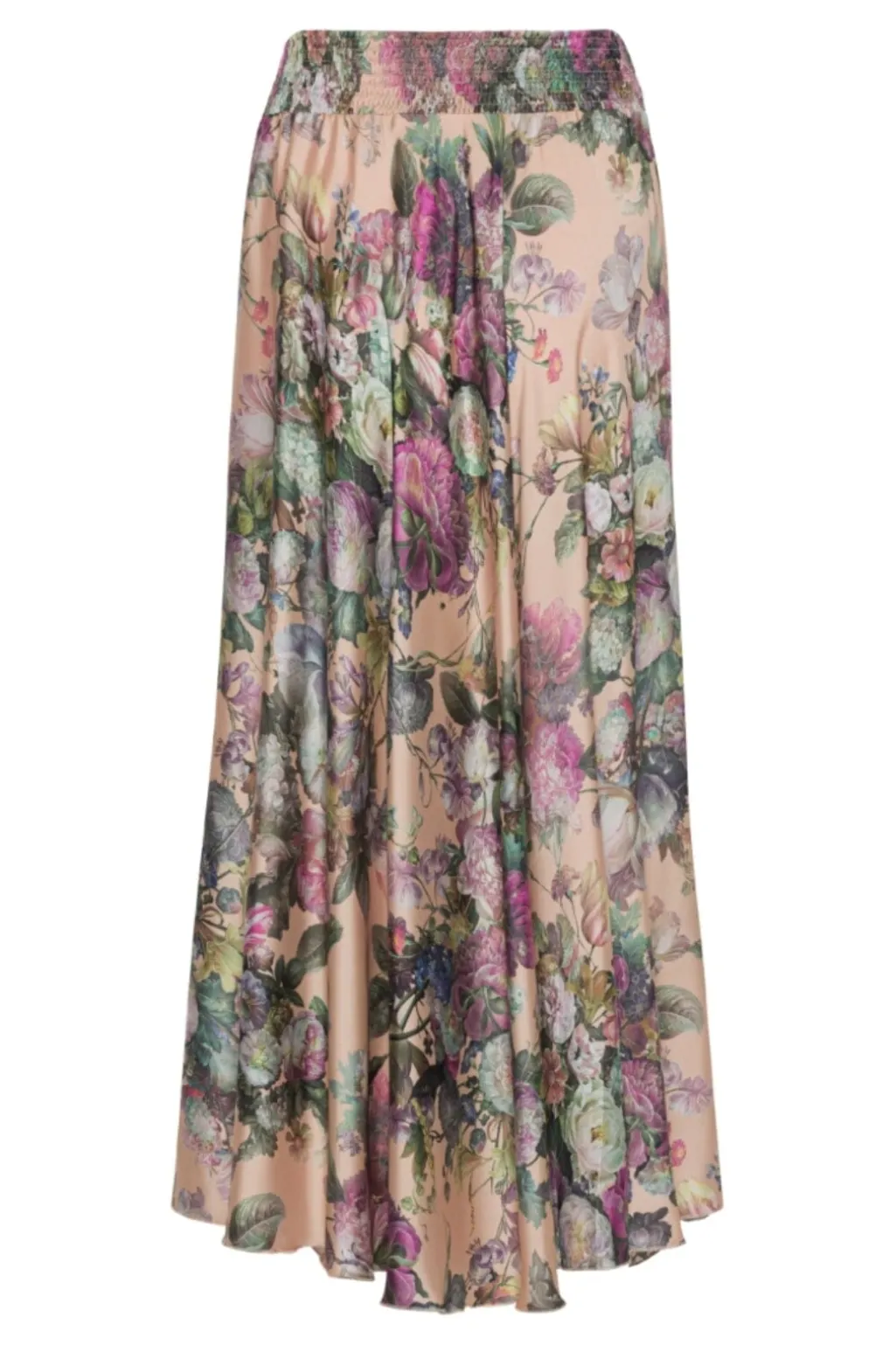 Ferskenfarvet nederdel i satin med blomstermønster i pink, grøn og lilla. Den har høj talje med elastik og ankellængde med flæser.