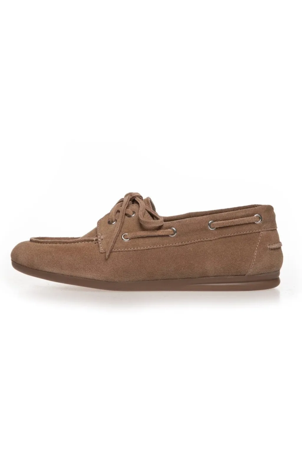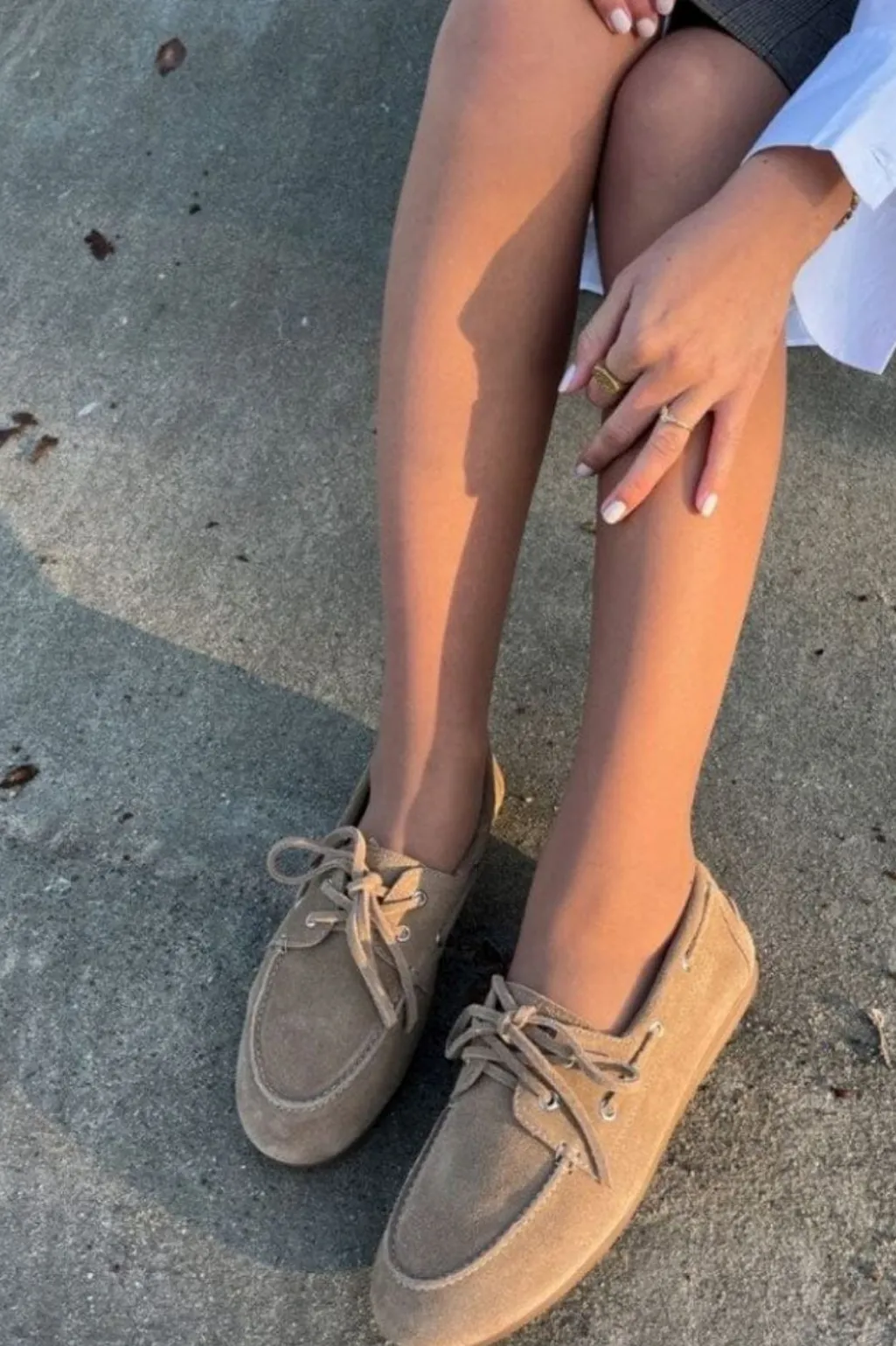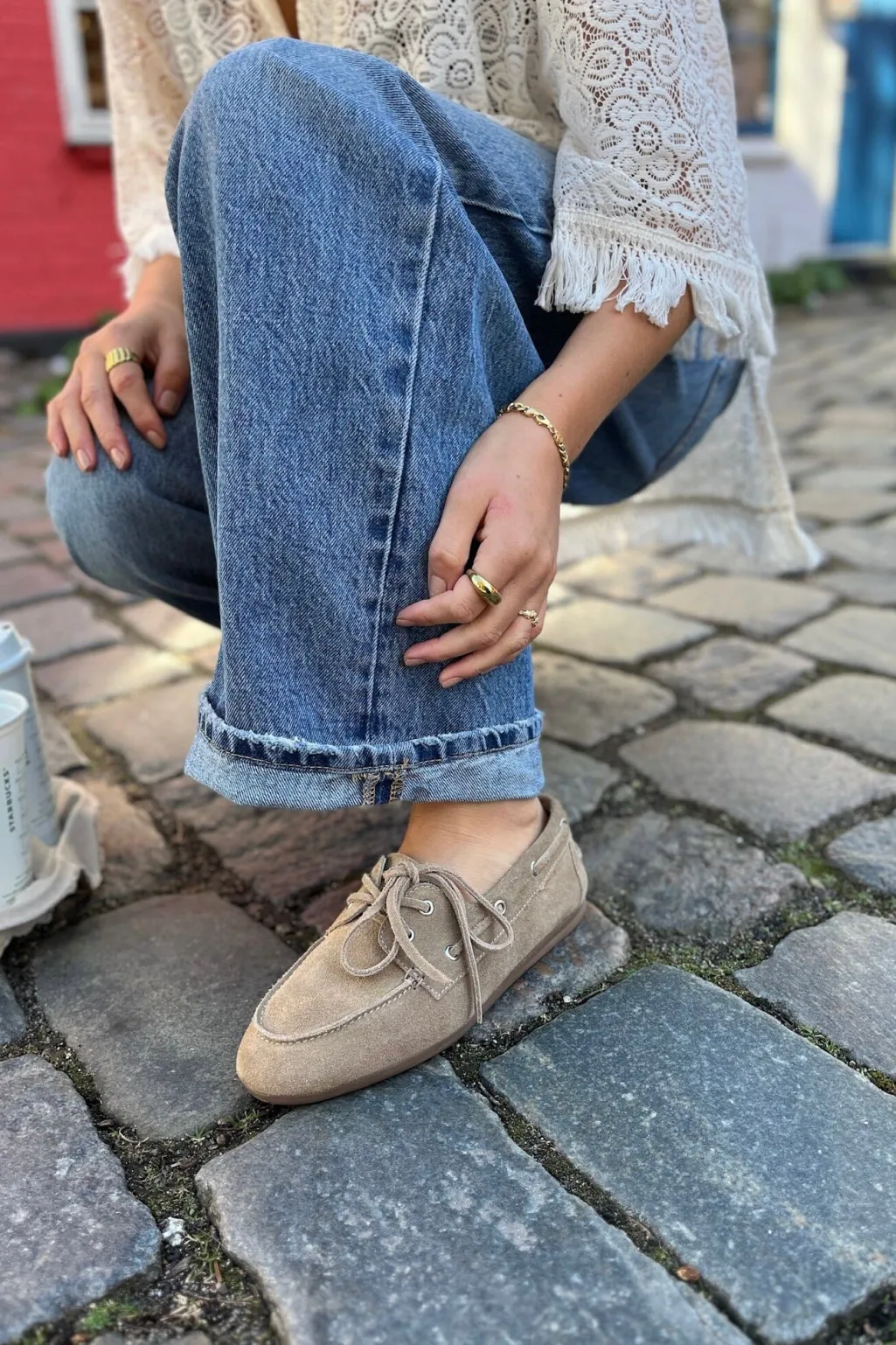 Beige loafers i ruskind med snørebånd. Skoene har en lav hæl og er lavet i en lys biscuitfarve, der passer til mange forskellige outfits.