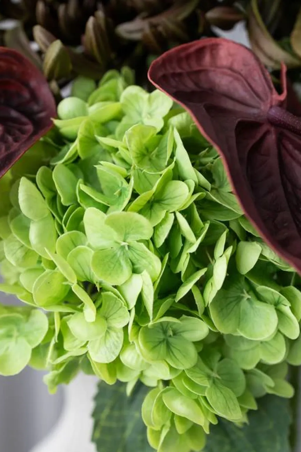 Buket fra Bloom Objects med grønne chrysantemum, mørkegrøn amaranthus og bordeaux-anthurium. Buketten er lavet af latex for et naturtro udseende.