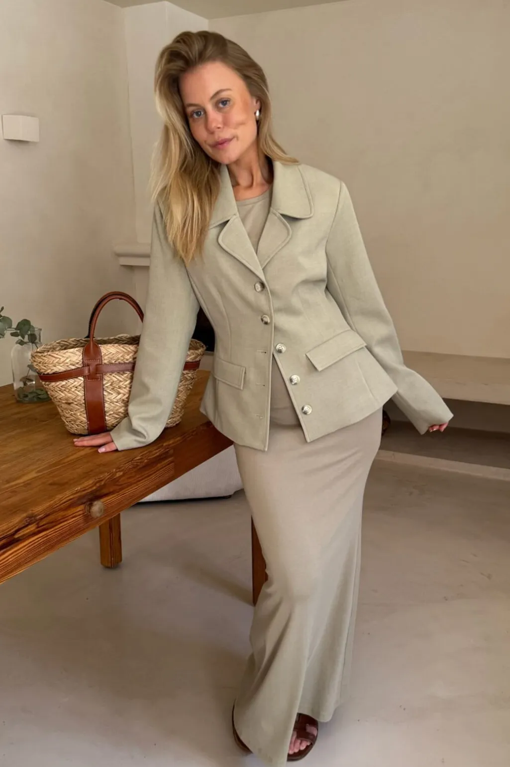 T-shirtkjole fra BYIC i khaki. Den har en tætsiddende silhuet fra top til tå og korte ærmer med rund halsudskæring.