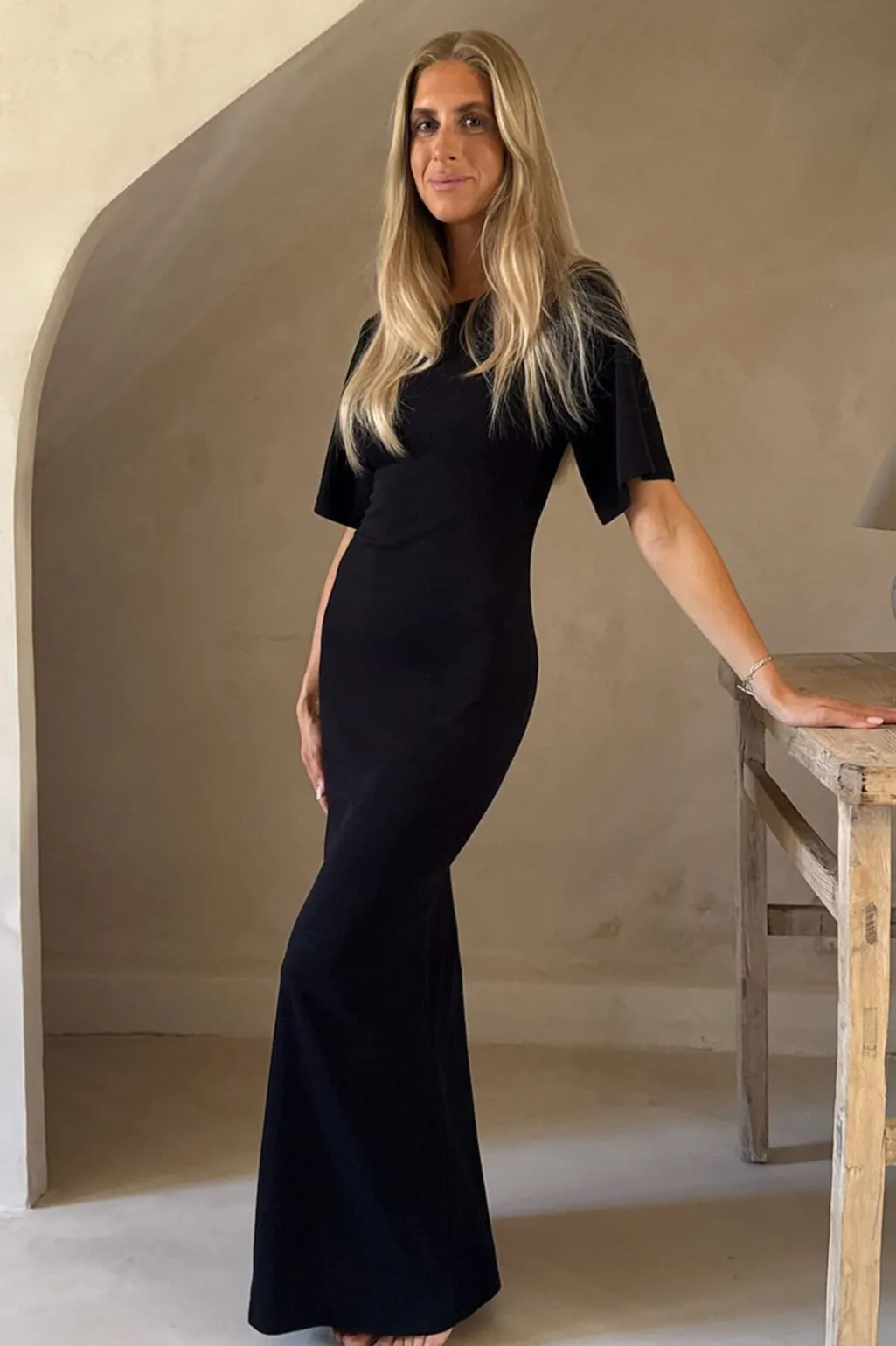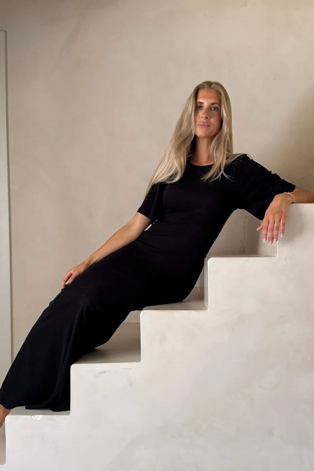 Sort T-shirtkjole fra BYIC med korte ærmer og rund halsudskæring. Den tætsiddende silhuet og gulvlængden giver kjolen et stilrent udtryk.