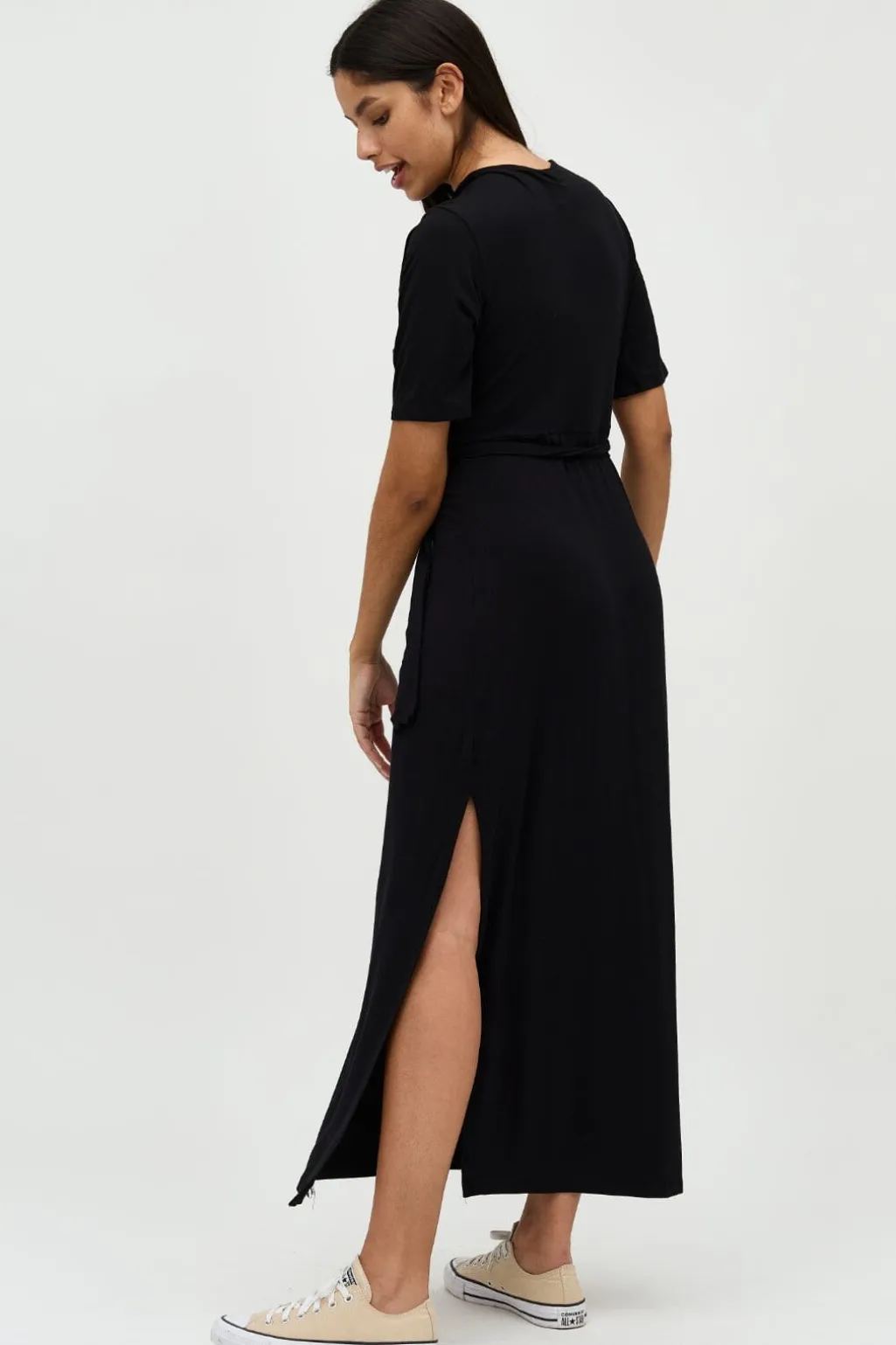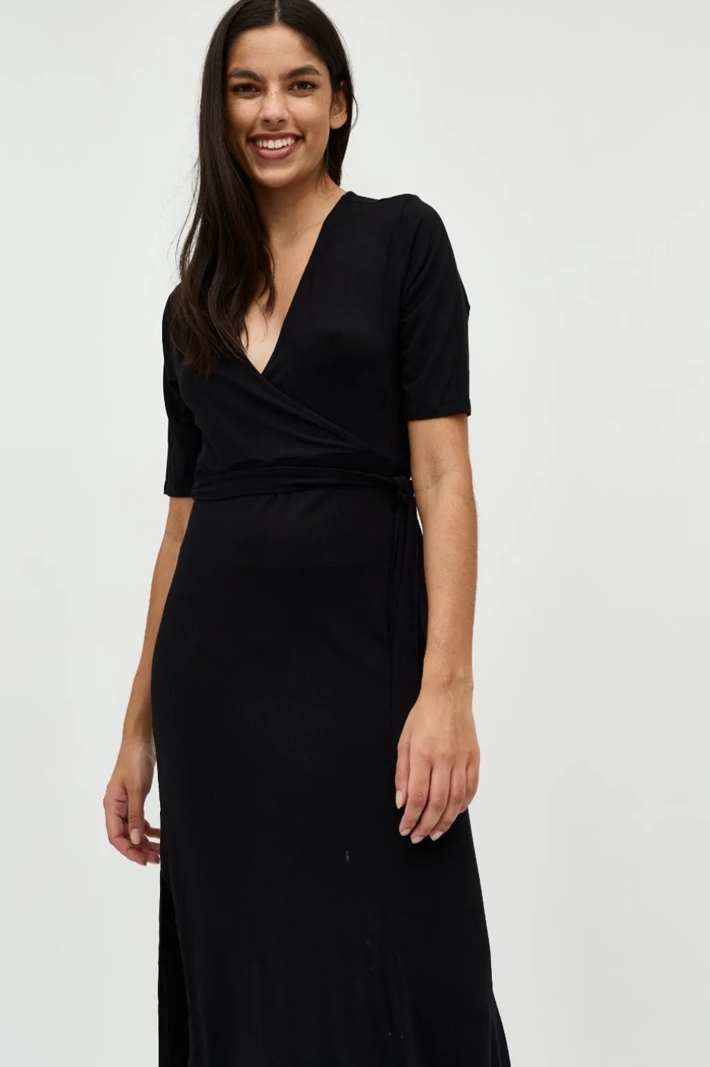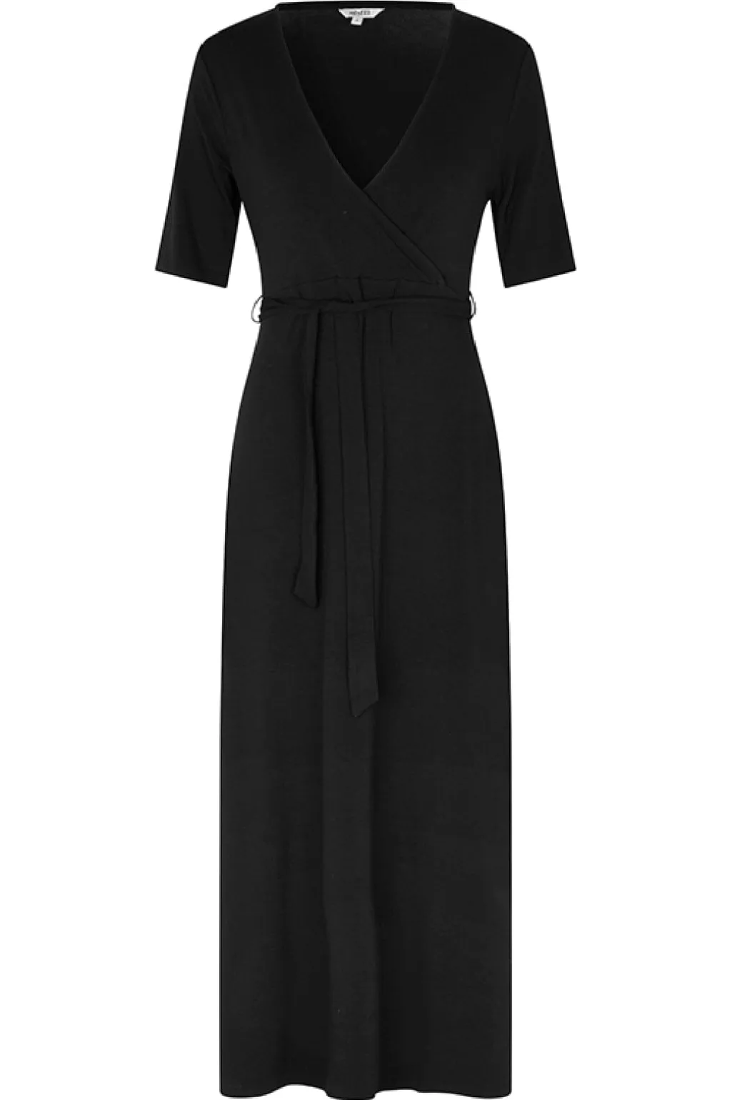 Sort ankellang kjole fra MbyM med v-udskæring og korte ærmer. Kjolen har bindebånd i taljen og en slids i siden. Den er lavet i en blød og behagelig materialeblanding.