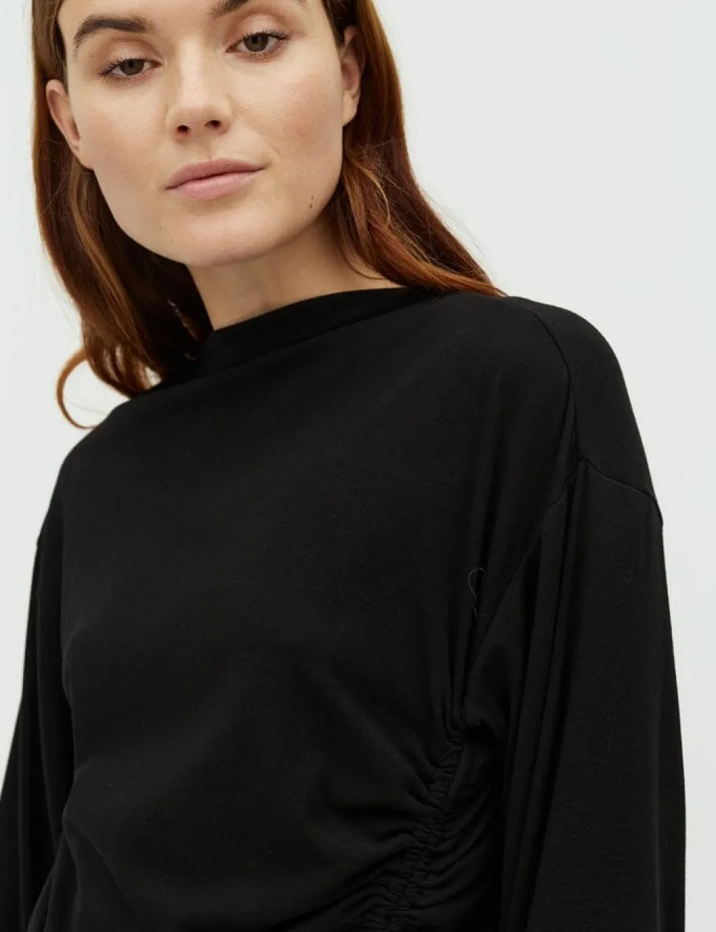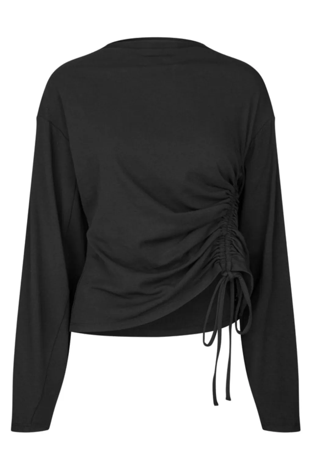 Sort top fra MbyM med lange ærmer og høj hals. Toppen har bindebånd i siden og flæsedetaljer.