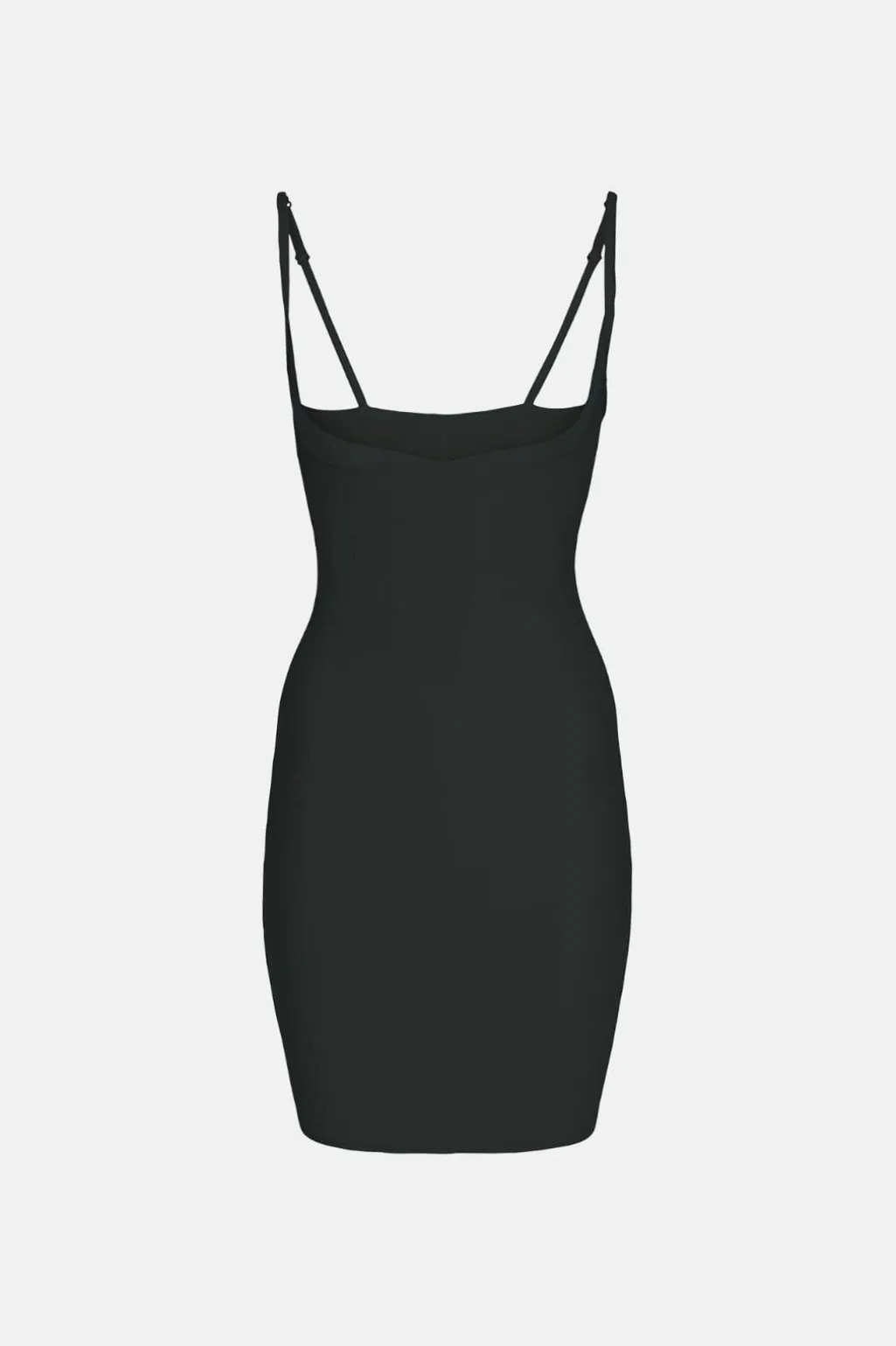 Sort shapewear-kjole fra Decoy med let, strækbart materiale og særlig konstruktion under barmen. Kjolen har V-udskæring og smalle stropper, der kan justeres efter behov.