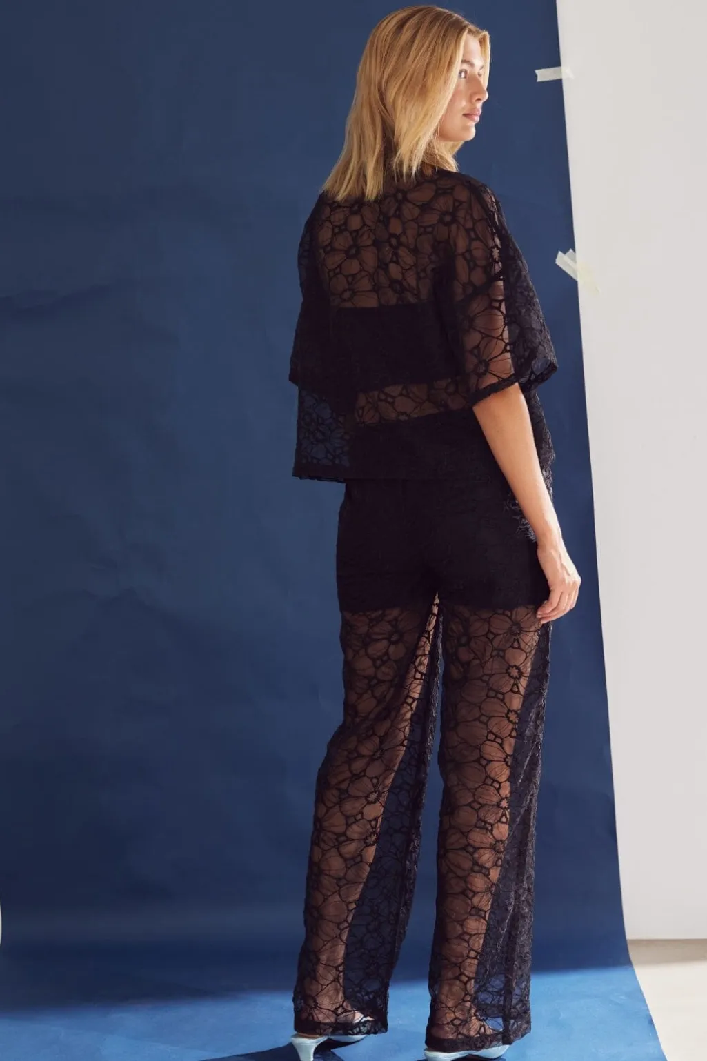 Sorte blondebukser fra Noella med gennemsigtig struktur og blomstermønster. Bukserne har en løs pasform og indershorts, designet til festlige anledninger.