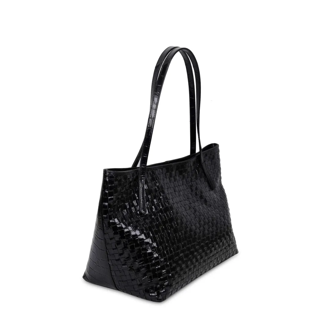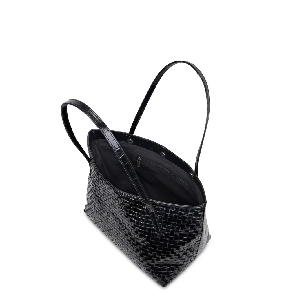 Sort shopper fra Núnoo med et karakteristisk flettet design. Tasken har et stort hovedrum med flere indvendige lommer og lange skulderstropper.