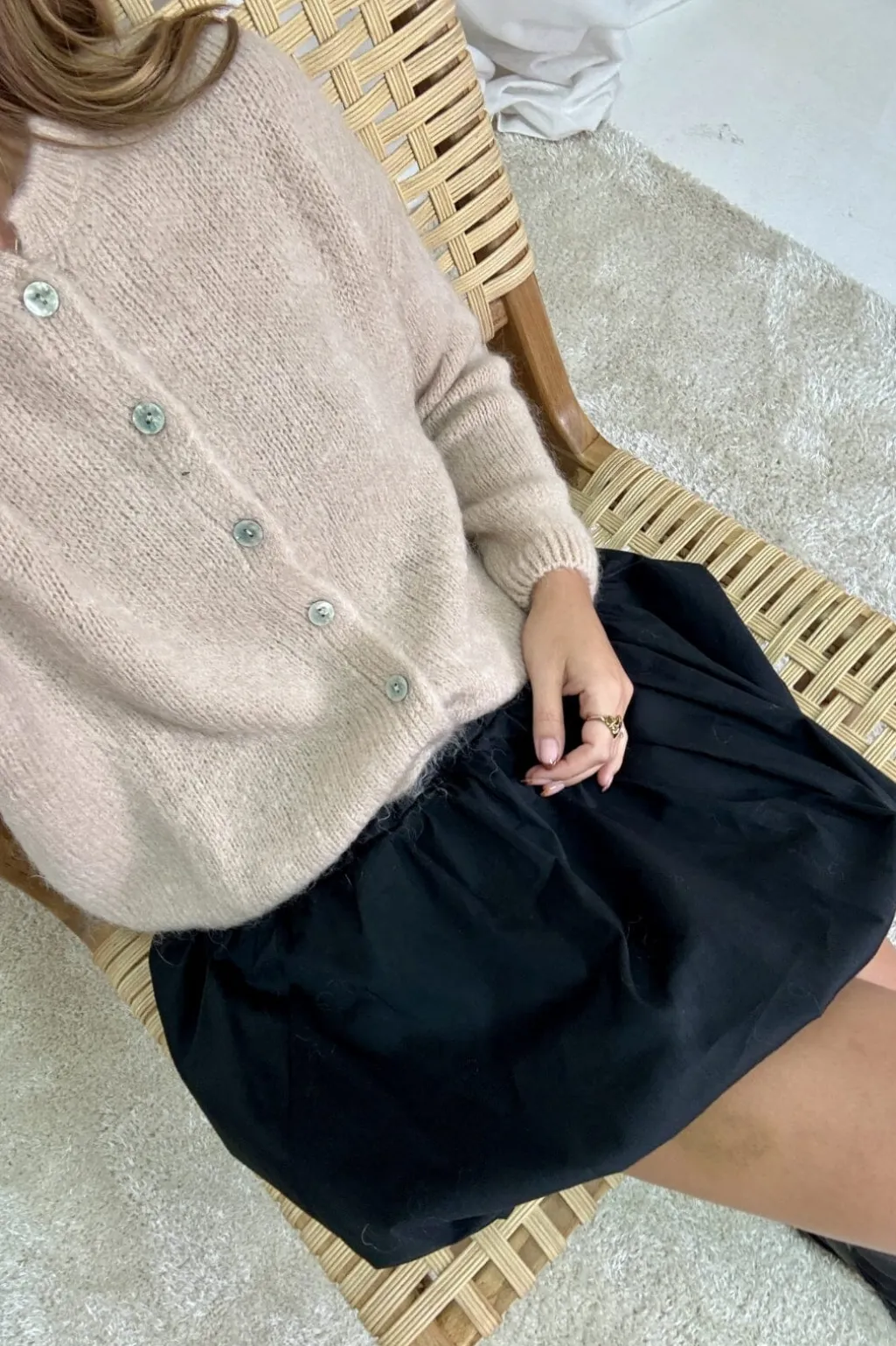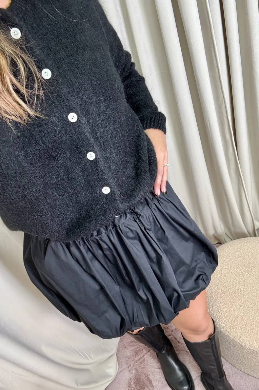 Sort ballonnederdel fra A-bee med rynket design. Nederdelen har en karakteristisk ballonform og sidder i normal taljehøjde med elastisk linning.