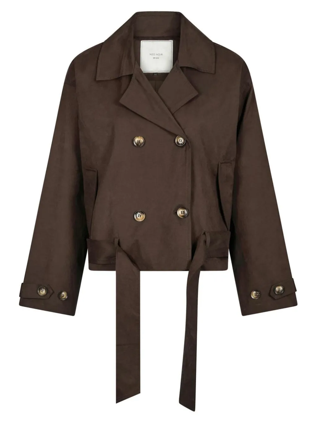 Kort jakke fra Neo Noir i chokoladebrun. Den dobbeltbrystede jakke har skjortekrave, lange ærmer og et bælte i taljen, der kan justeres efter ønske.