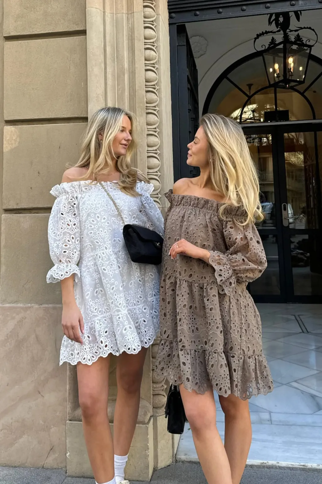 Off-shoulder kjole fra BYIC i mocca brun. Kjolen har broderede huller i stoffet, lagdelt nederdel med flæser og korte ærmer med flæsekanter.