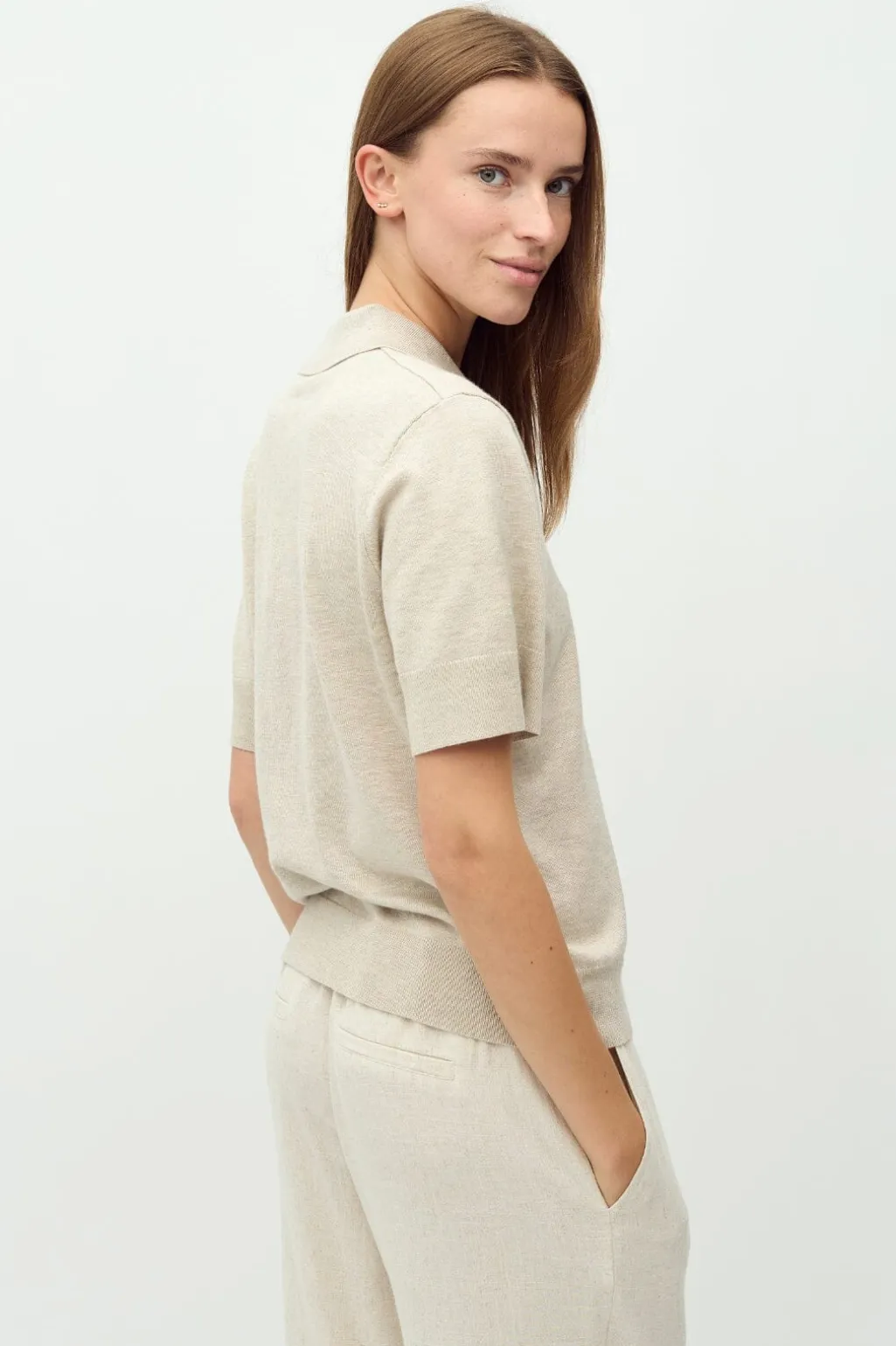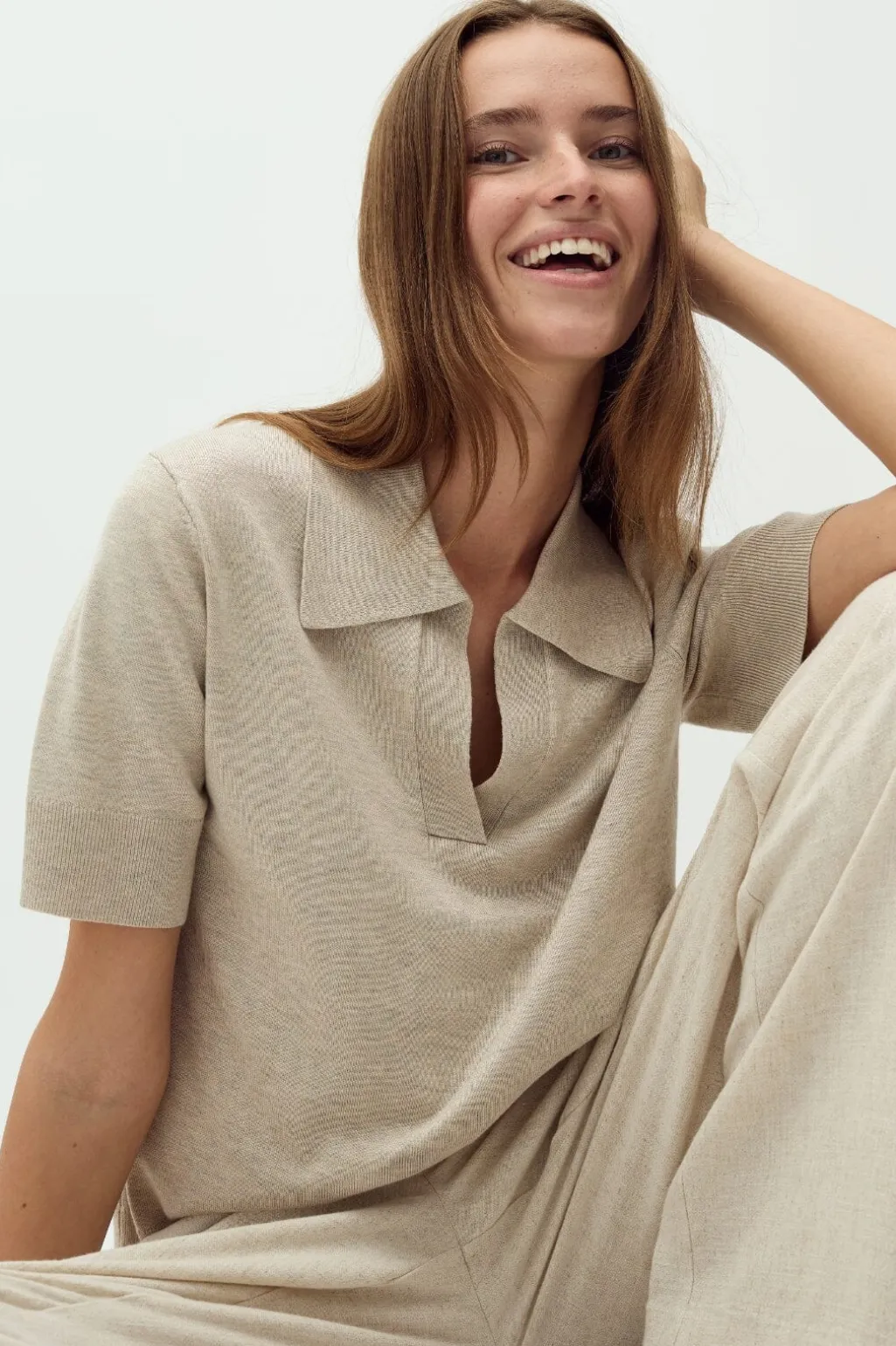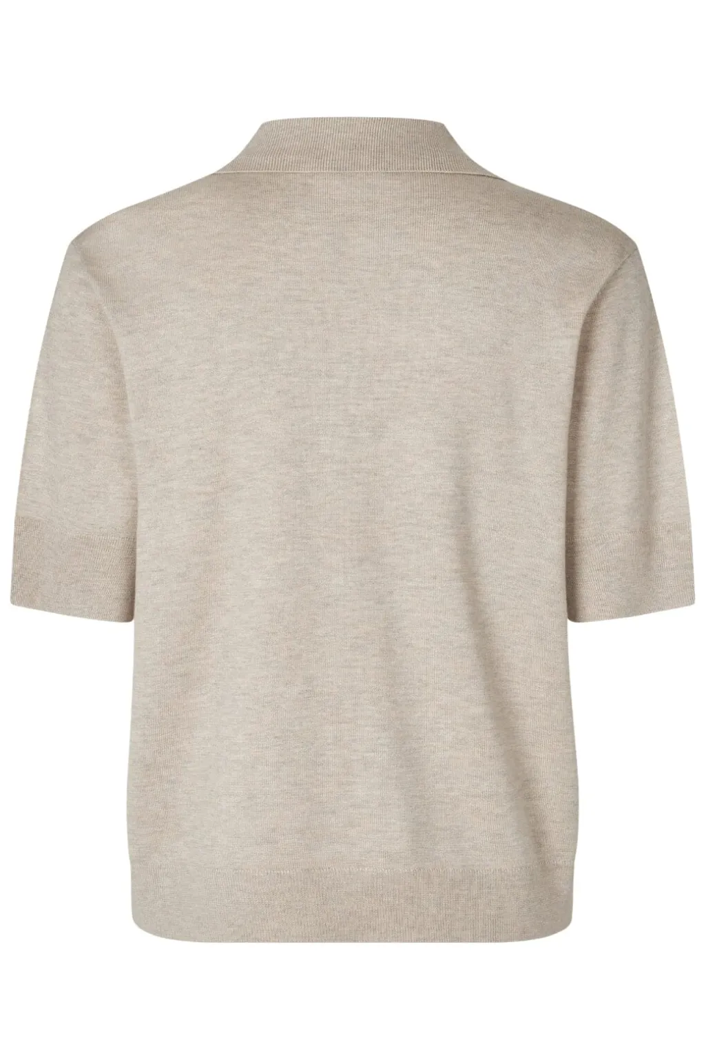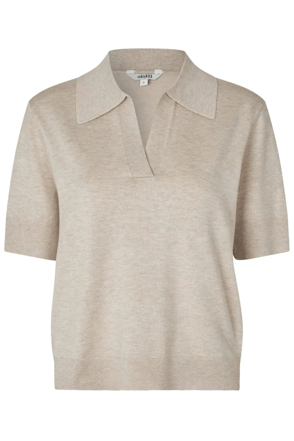 Kortærmet pullover fra MbyM i lys beige meleret. Den har en V-udskæring med polokrave og en strikket kvalitet med en blød overflade.