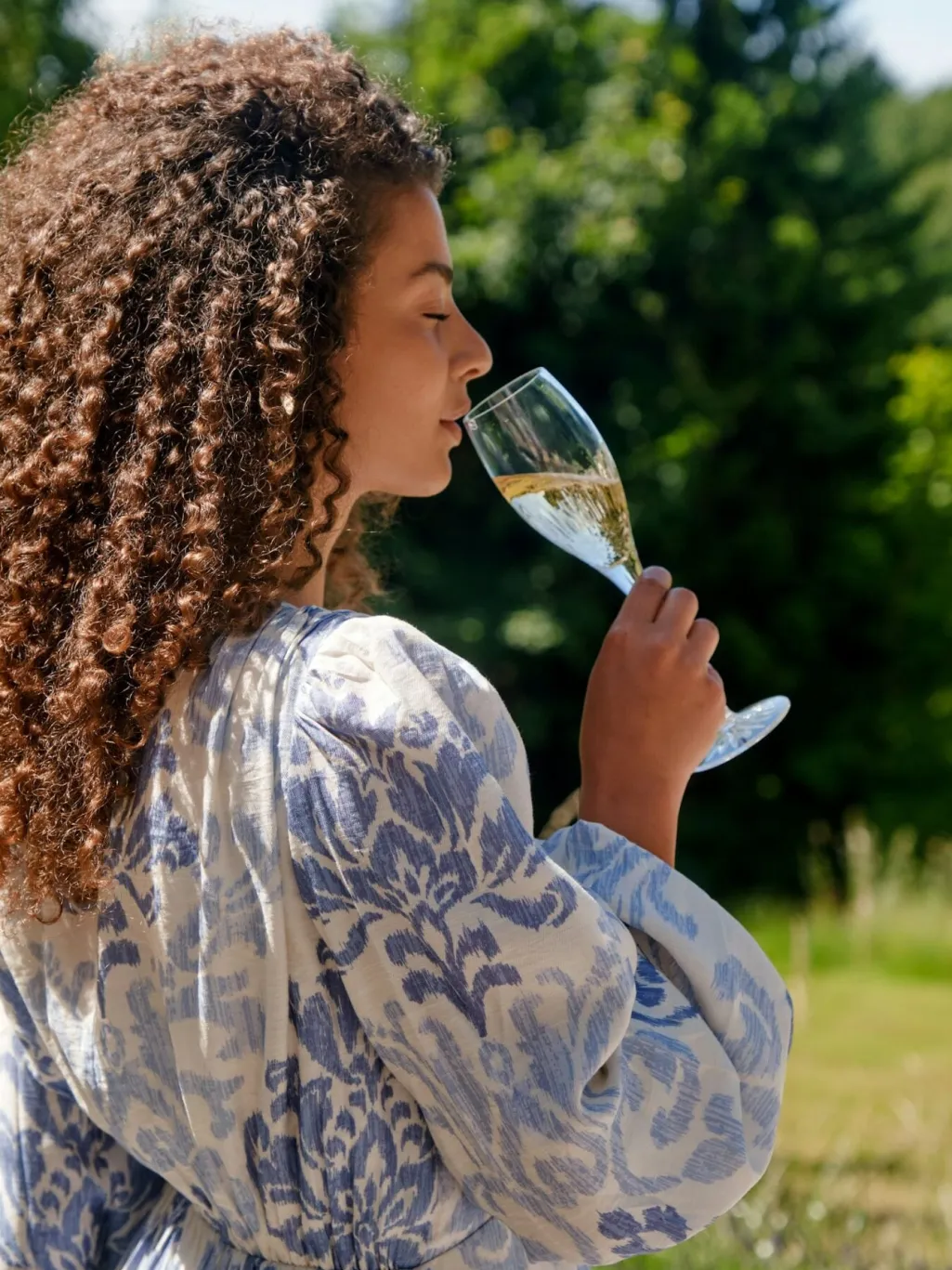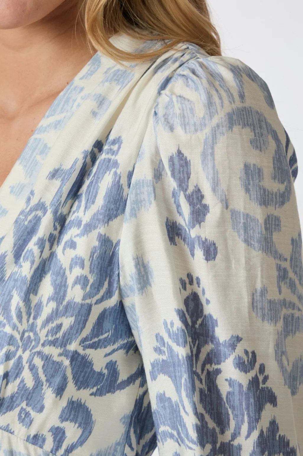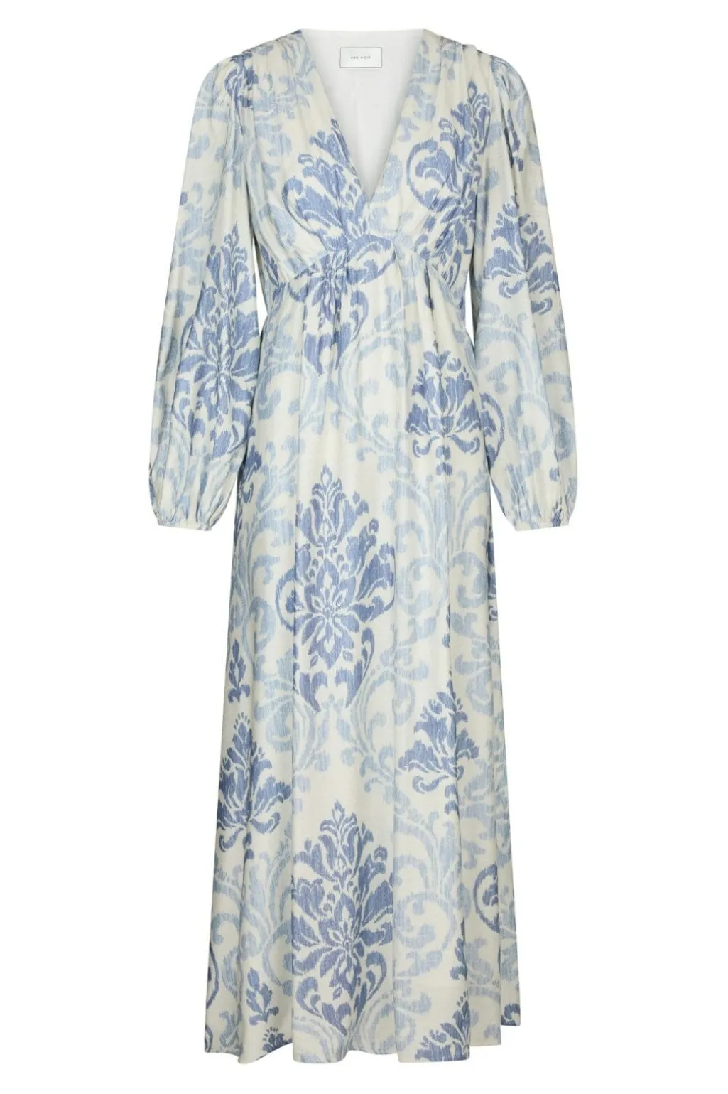 Lang kjole fra Neo Noir i lyseblå og hvid med blomstermønster. Den har en dyb V-udskæring og lange pufærmer med elastik ved ærmekanten.