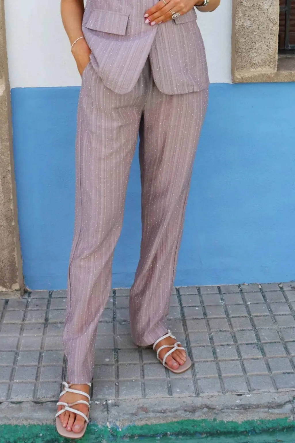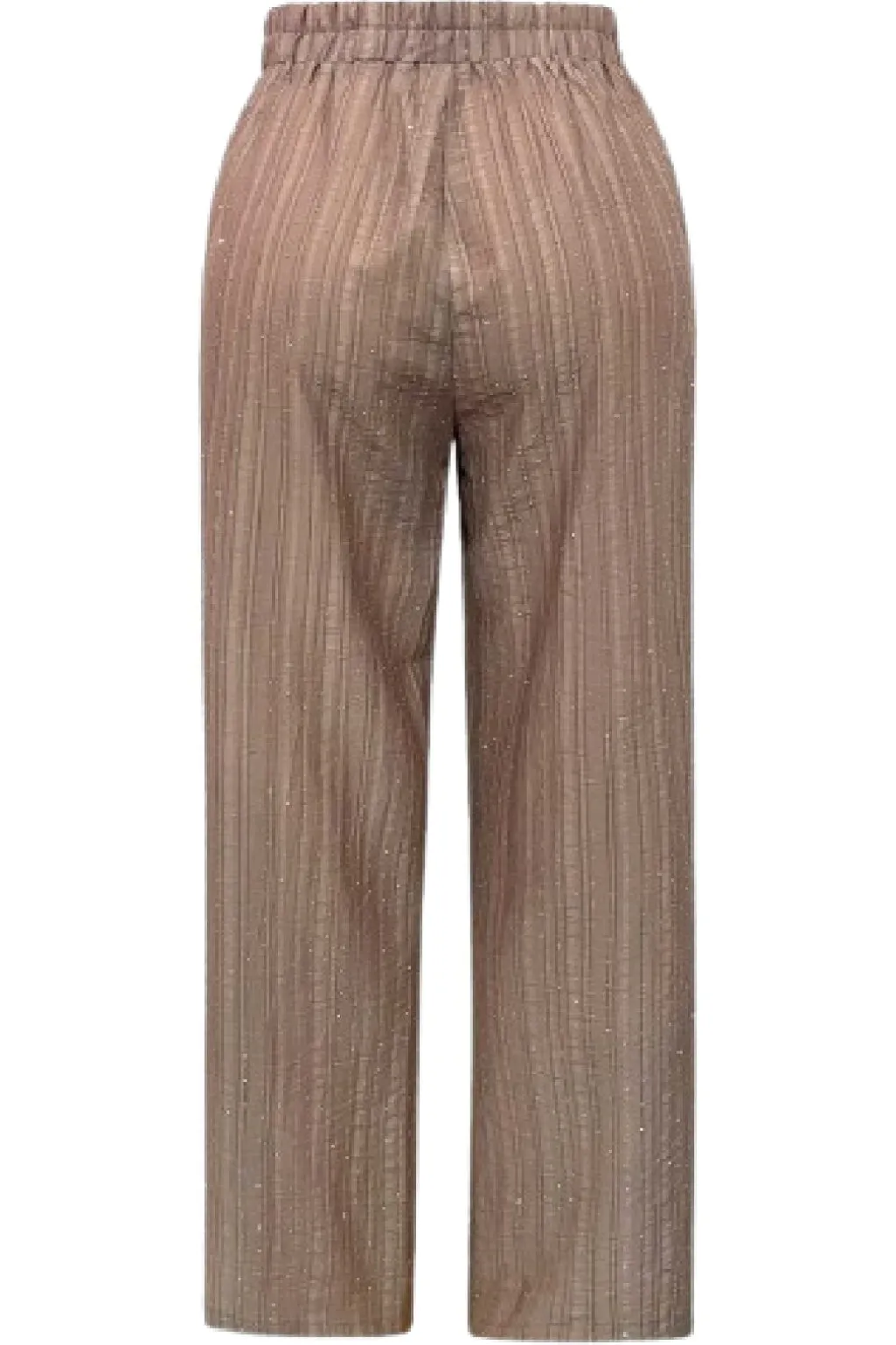 Lysebrune bukser fra Liberte med striber og pailletter. Bukserne har en løs pasform og flæsedetaljer, der skaber et let og luftigt udtryk.