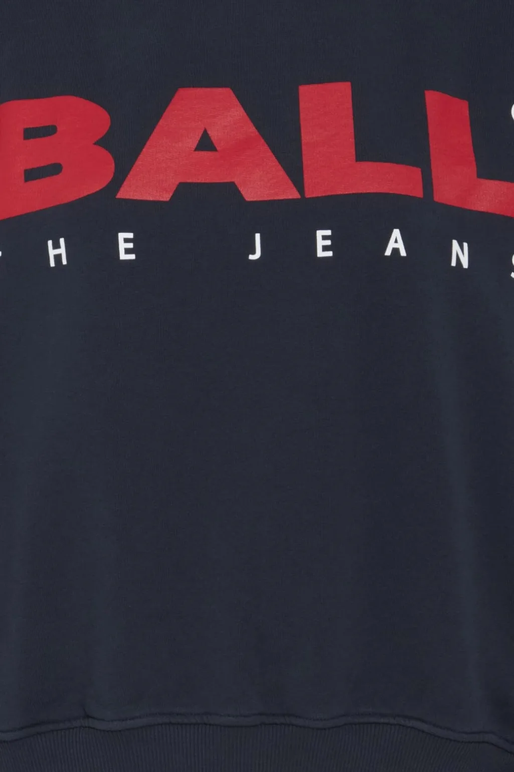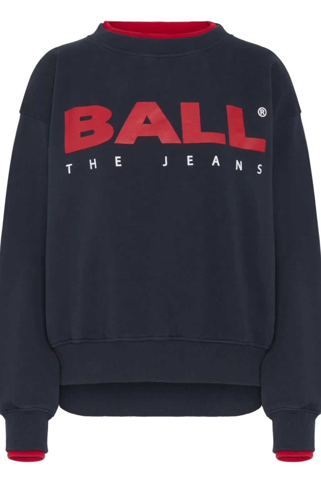Navyblå sweatshirt fra Ball med røde detaljer ved halsen og ærmerne. Den har et stort rødt BALL-logo på fronten med teksten THE JEANS under.