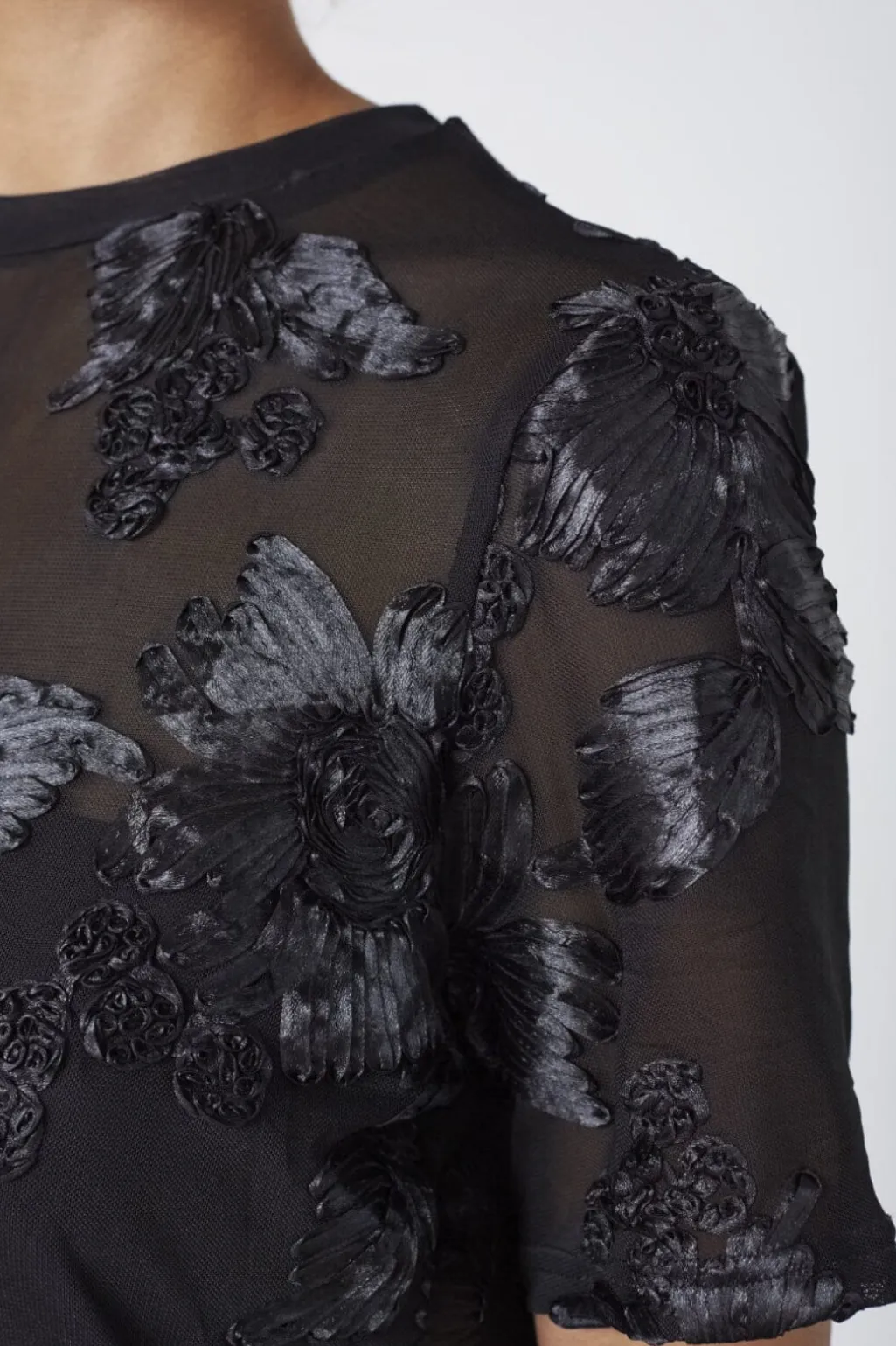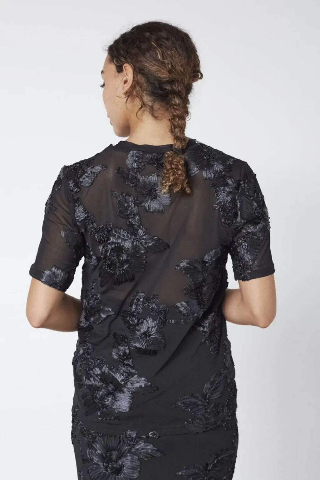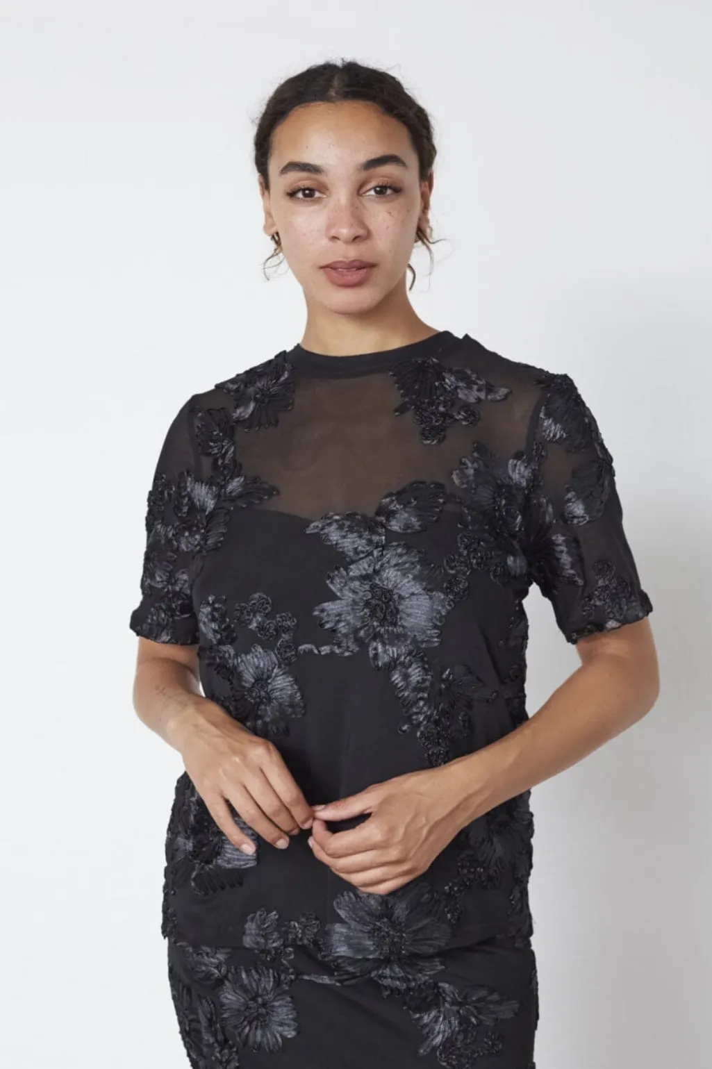 Sort T-shirt fra Sisters Point med broderede blomstermotiver. Materialet er delvist gennemsigtigt øverst og giver T-shirten et dekorativt udtryk.