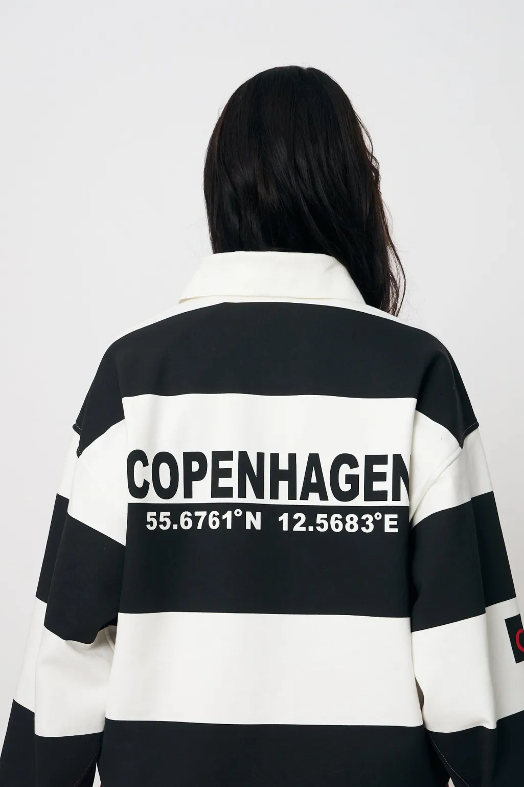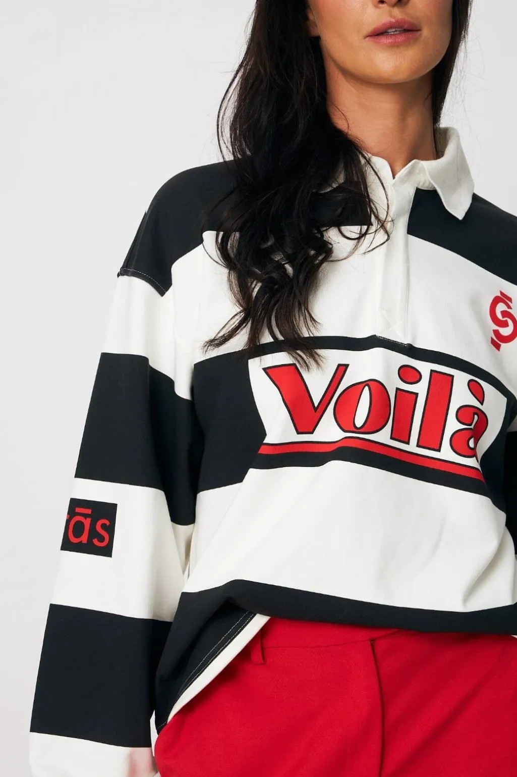Sort og elfenbenfarvet bluse fra Cras med striber og grafisk Voilà-print i rød. Blusen har en oversized pasform med polokrave og lange ærmer.
