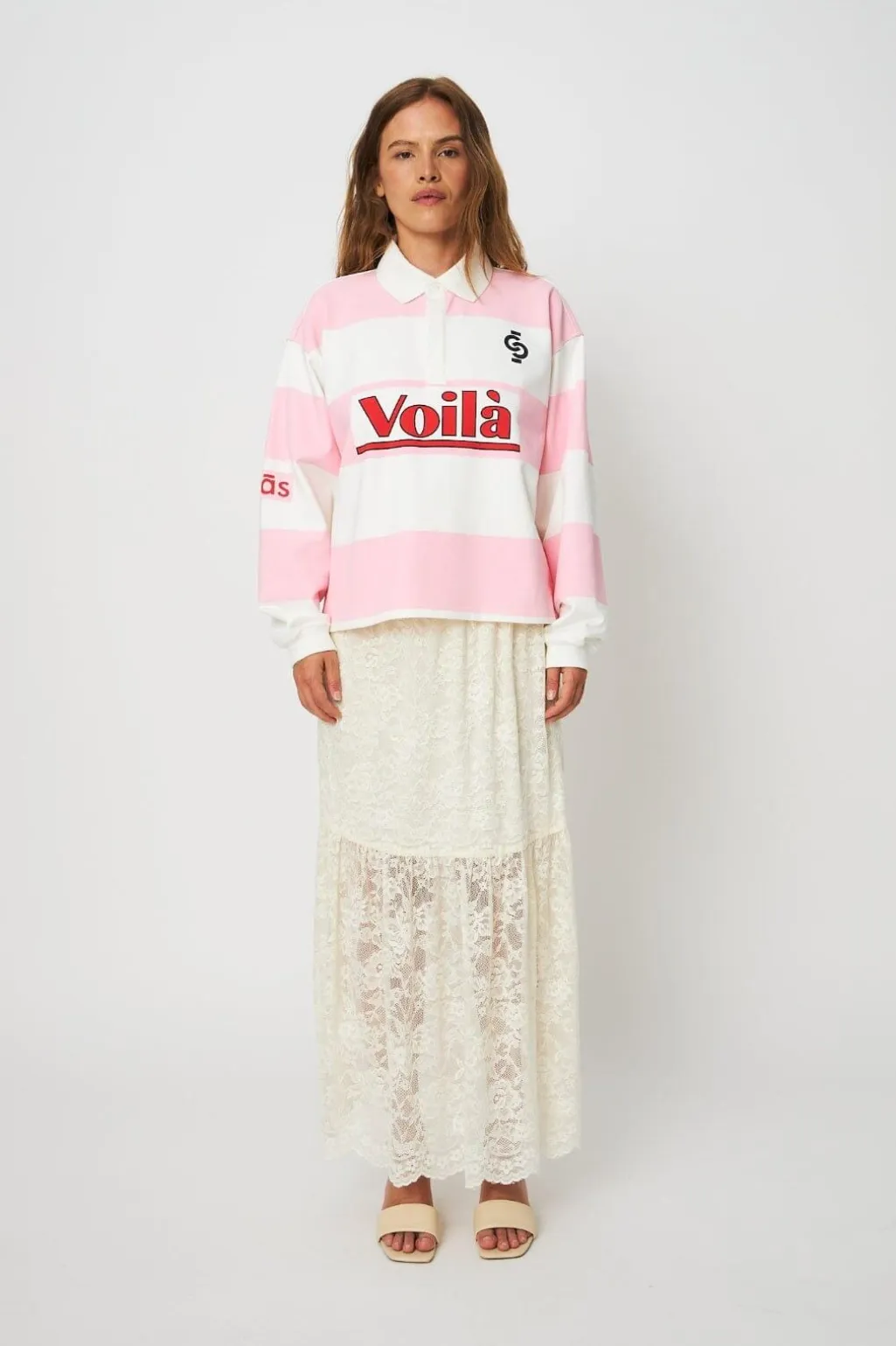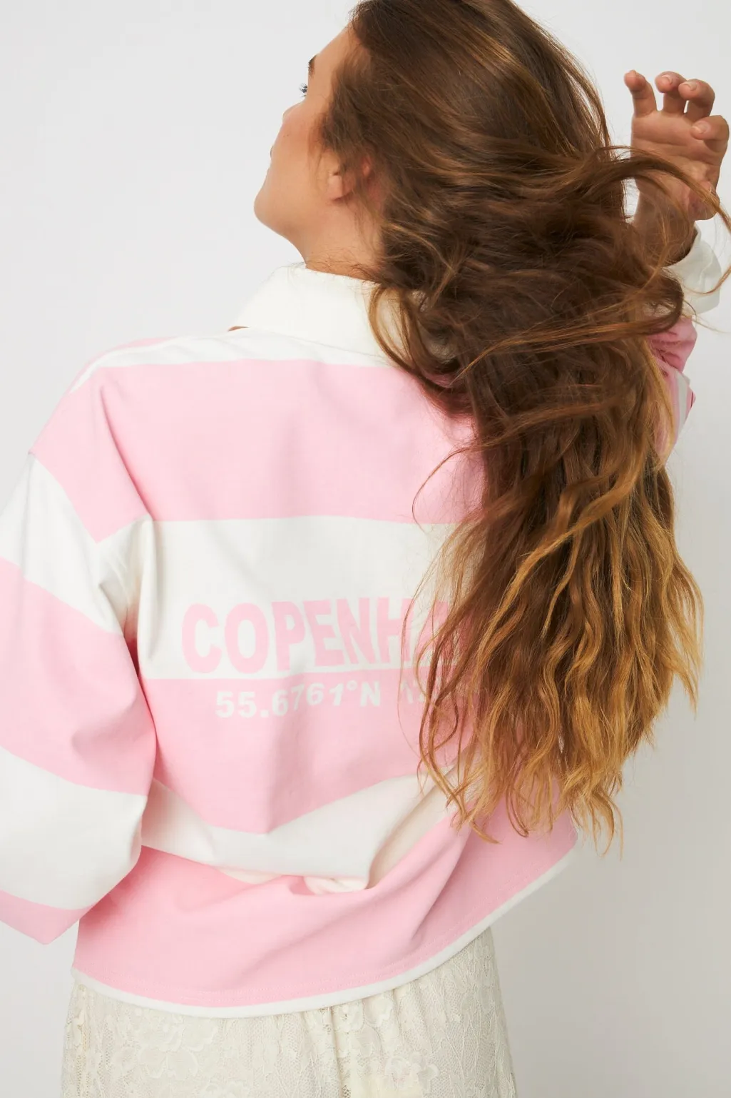 Lyserød og hvid bluse fra Cras med striber og polokrave. Den oversized bluse har lange ærmer og broderet Voilà-tekst på forsiden. Cras-logoet er synligt på ærmet.