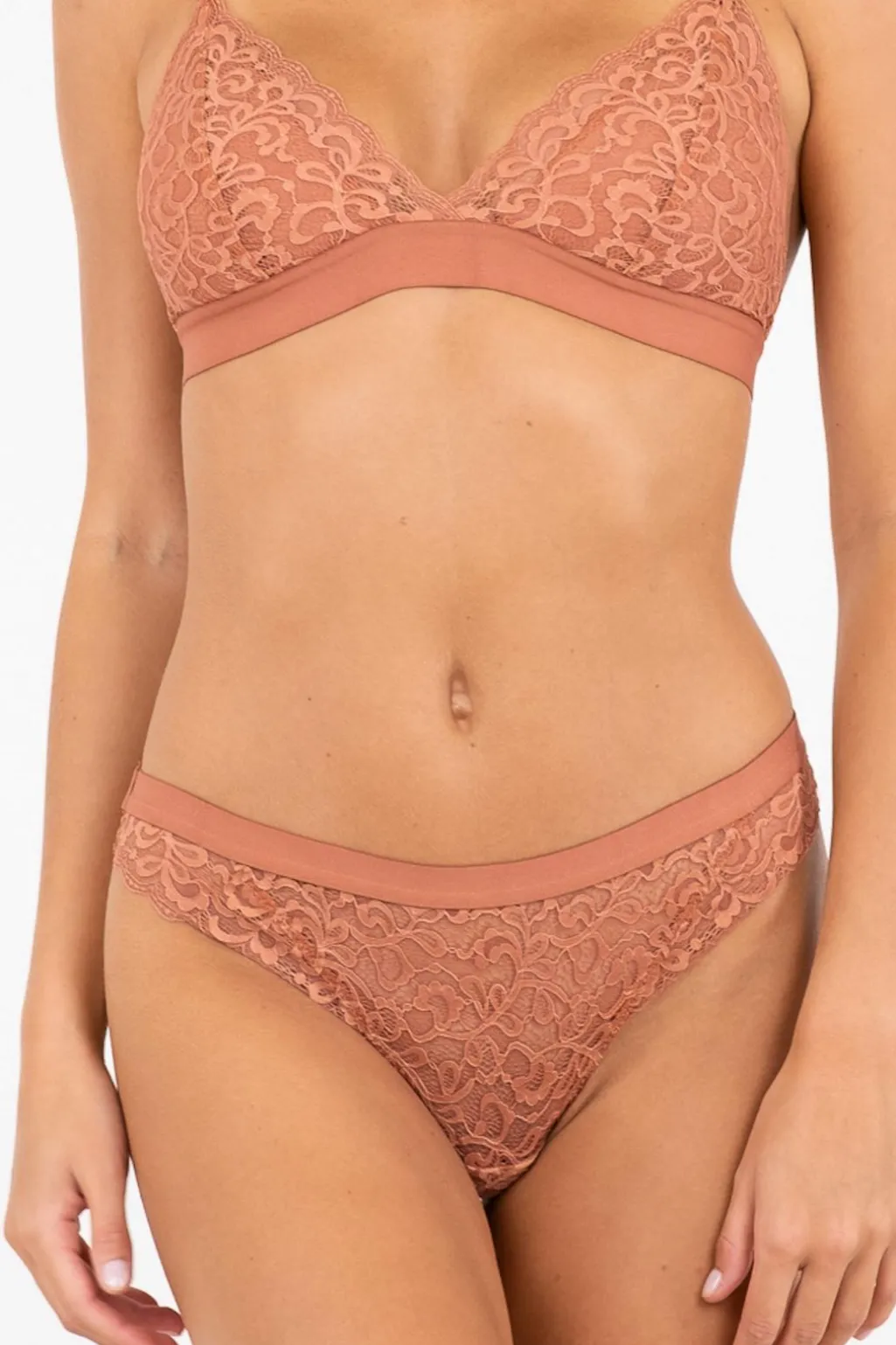 Trekants-BH fra Neo Noir i toffee-farvet materiale. Den blødt polstrede BH har et blomstret blondemønster og tynde skulderstropper med god støtte.