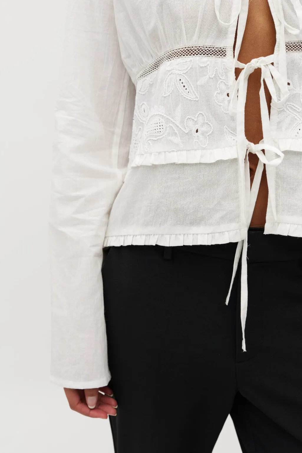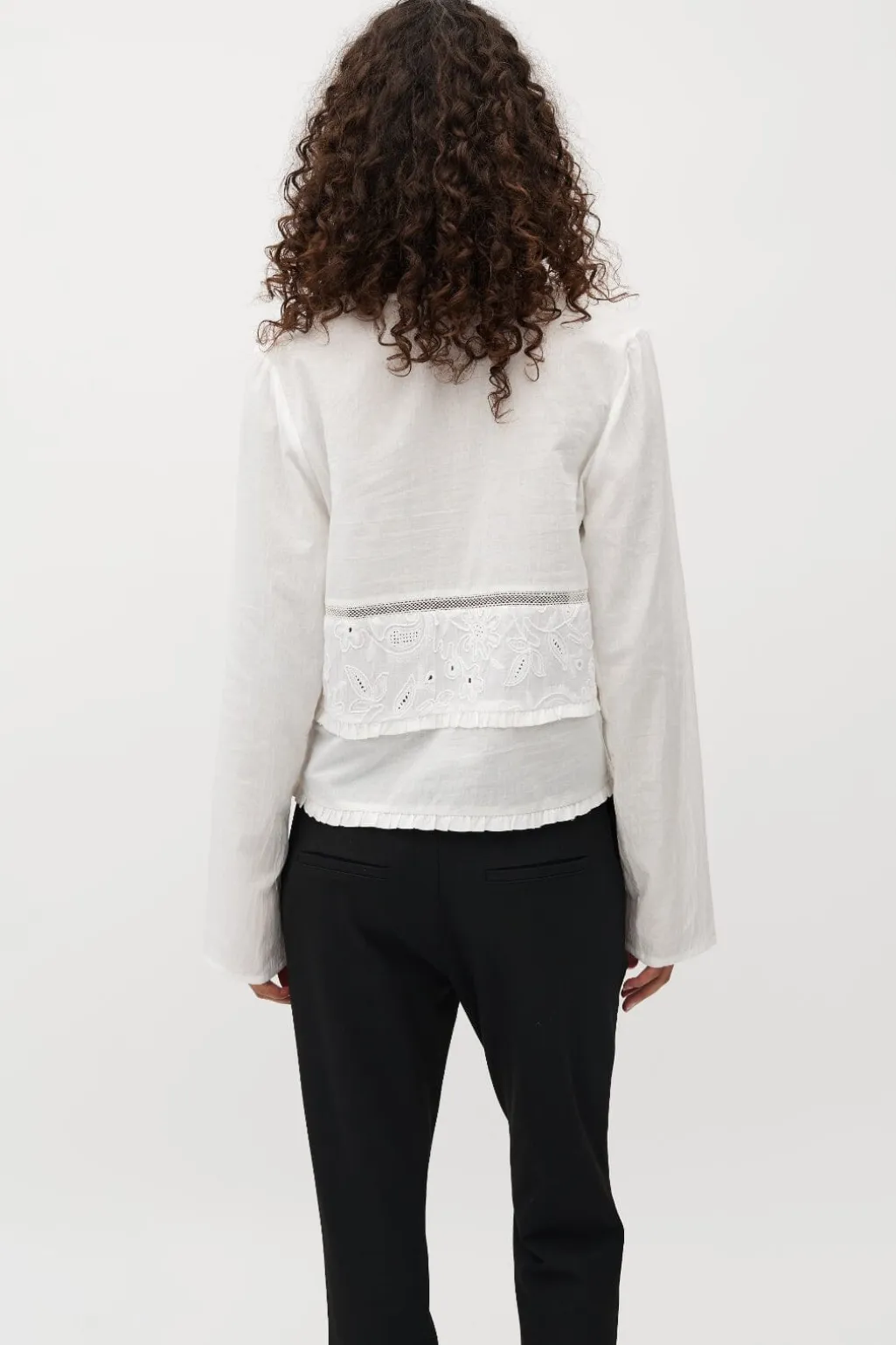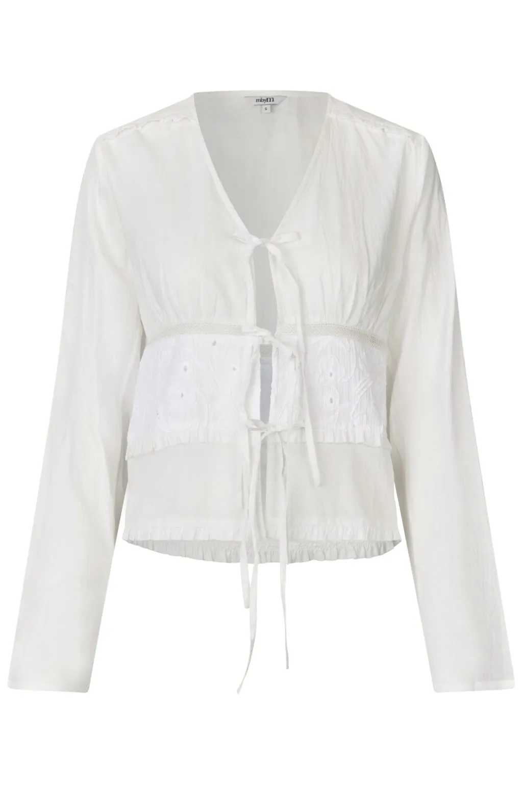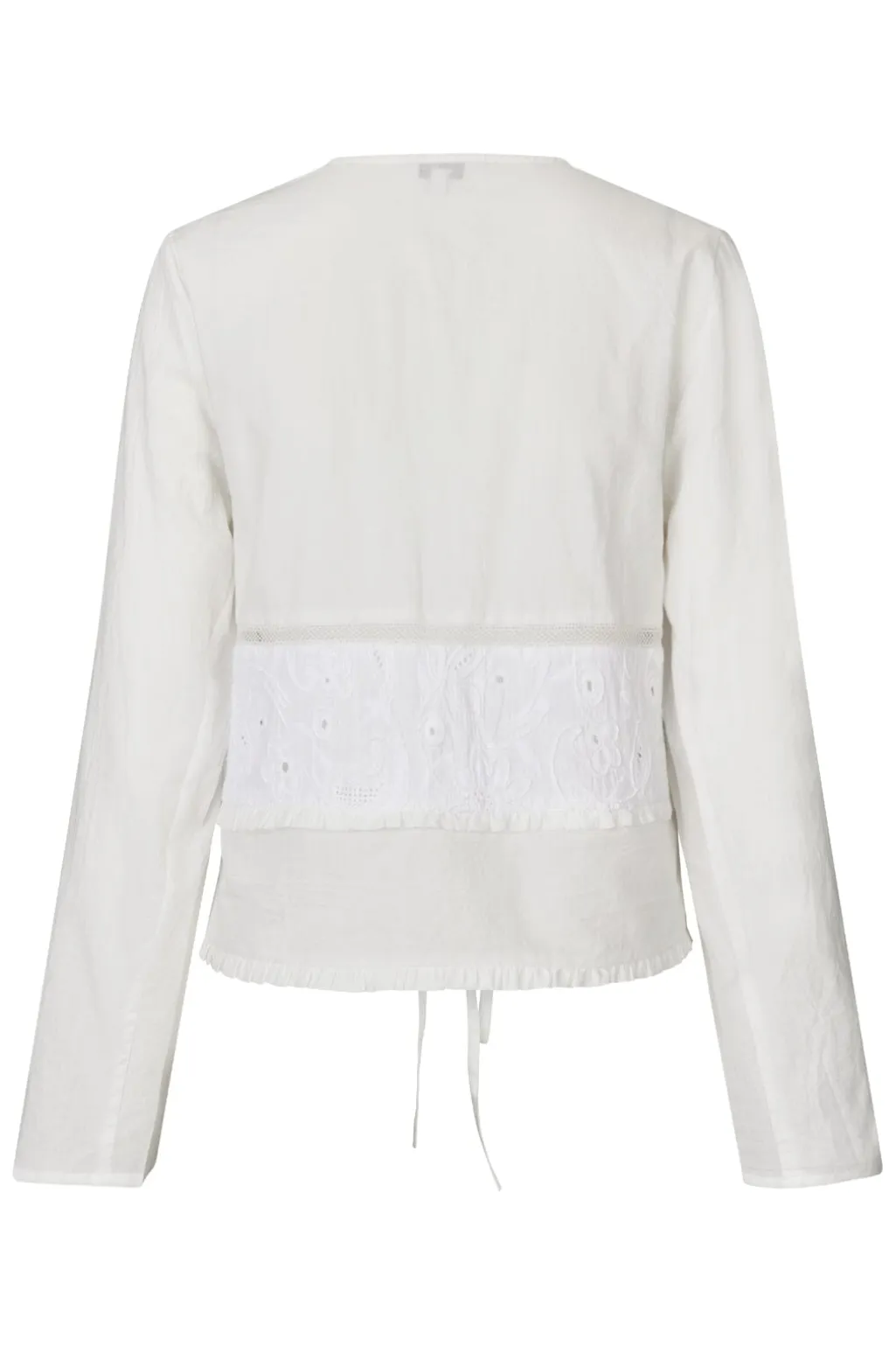 Hvid bluse fra MbyM med V-hals og snørebånd. Blusen har broderede blomsterdetaljer og flæser, der giver et feminint præg. De lange ærmer gør den brugbar året rundt.