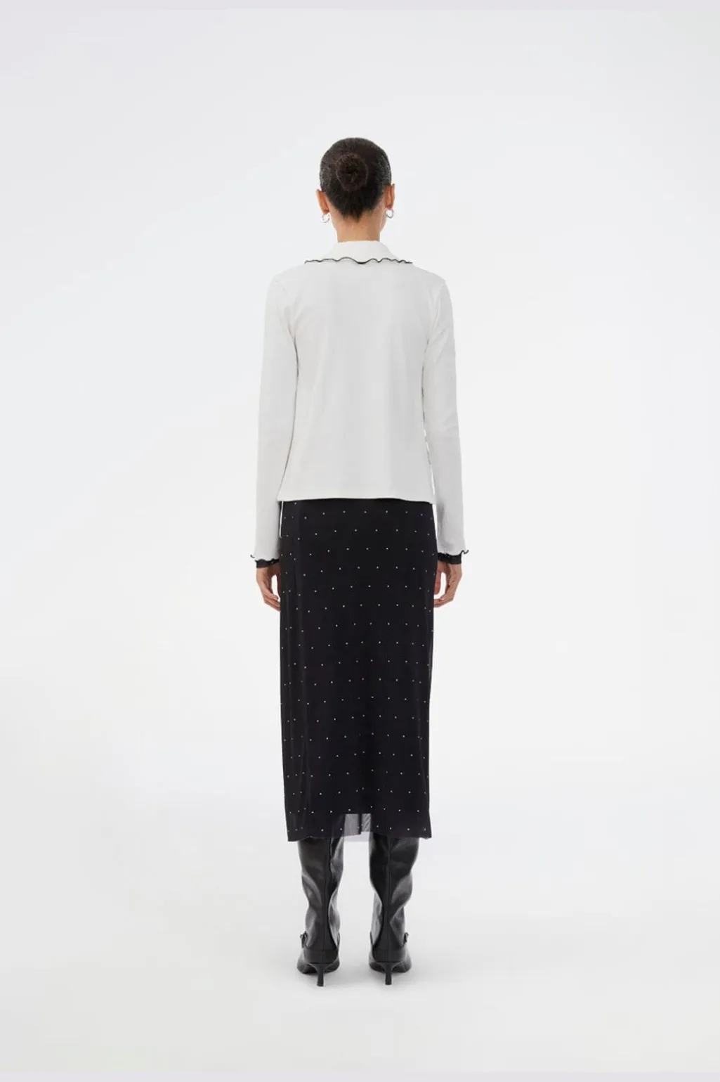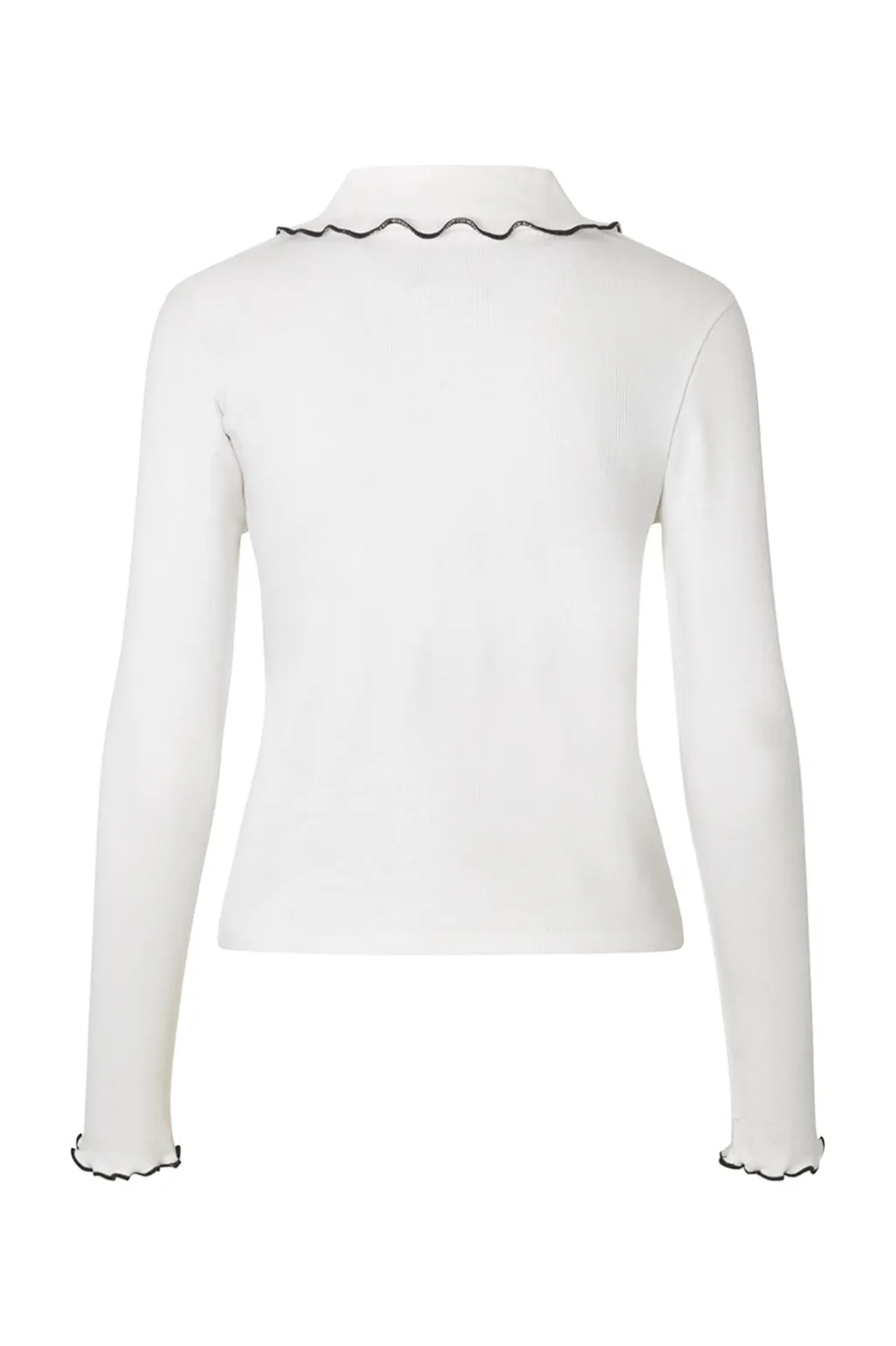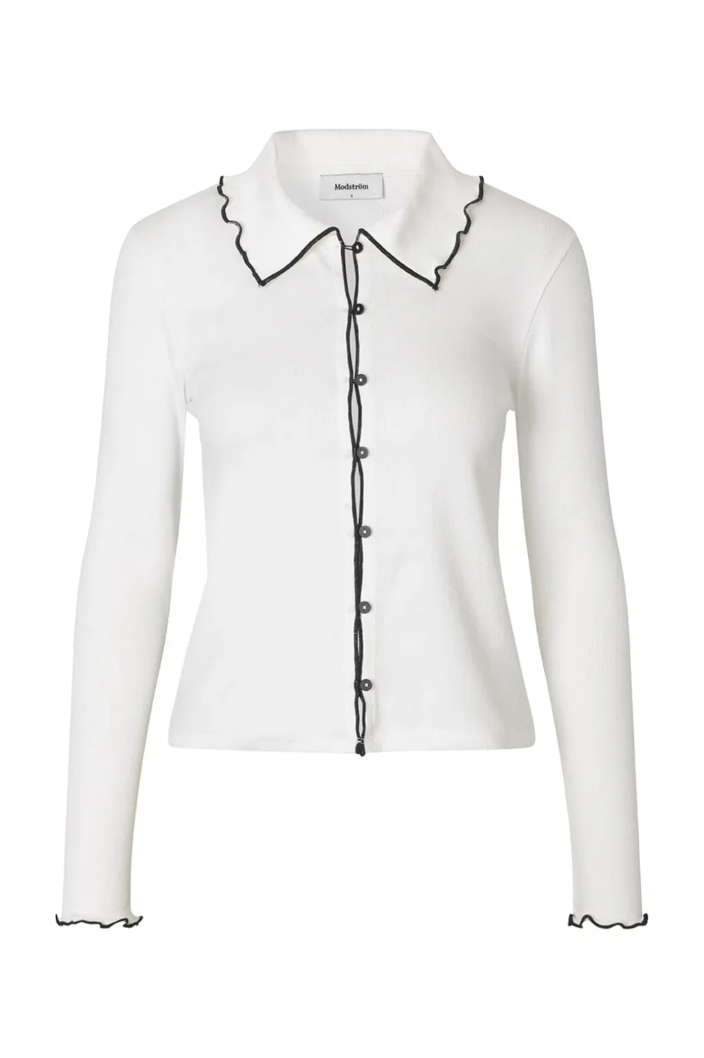 Hvid top fra Modström med Peter Pan-krave og sorte kanter. Toppen er fremstillet i økologisk bomuld med knaplukning foran og dekorative syninger langs kanterne.