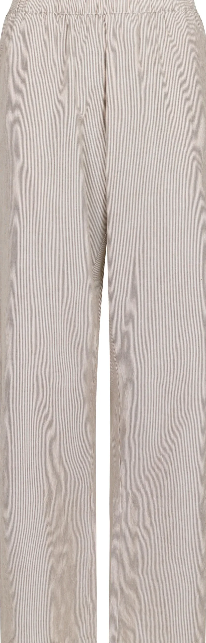 Stribede bukser fra Neo Noir i sandfarvet bomuld. De har en løs pasform med bredt bukseben og elastisk talje med bindebånd.