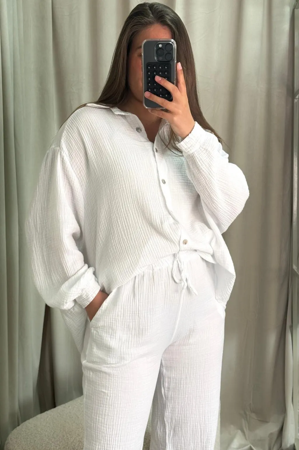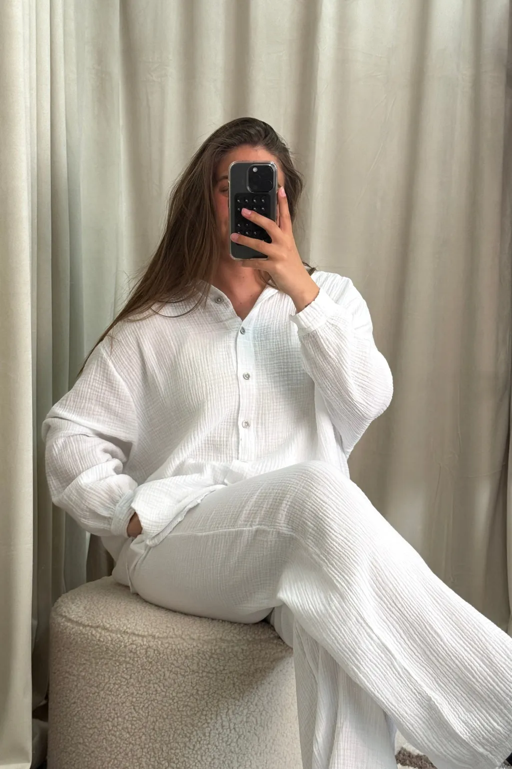 Hvid skjorte fra A-bee med struktureret bomuldsoverflade. Skjorten har en oversized silhuet med knaplukning foran og løse ærmer, der giver god bevægelsesfrihed.