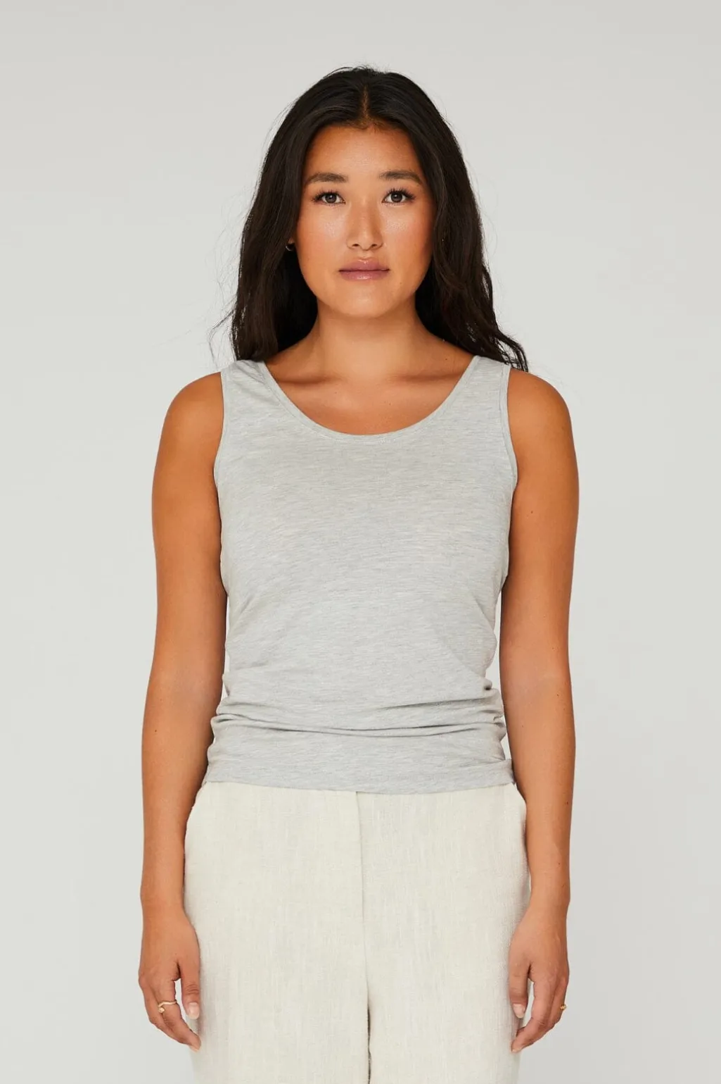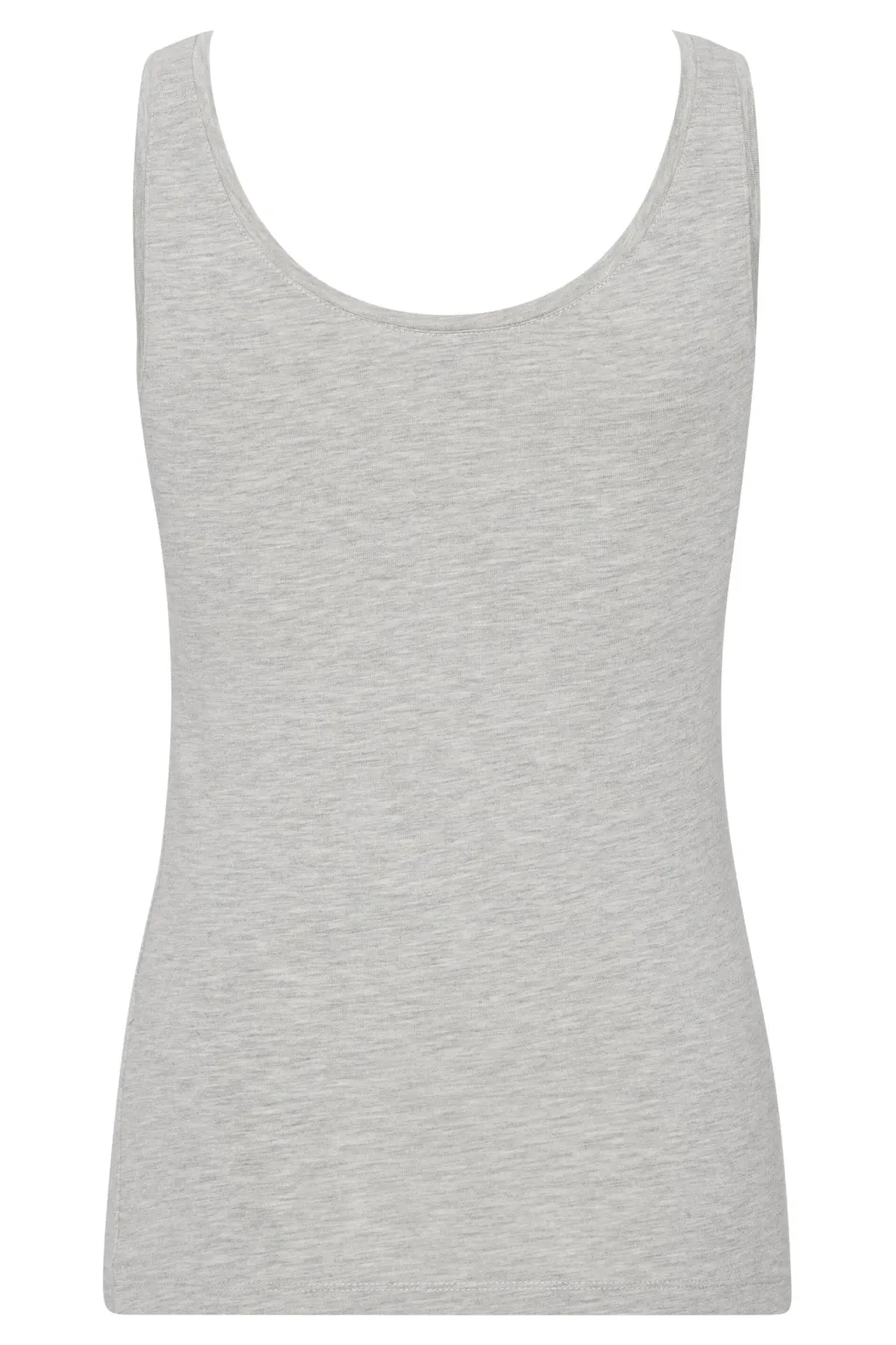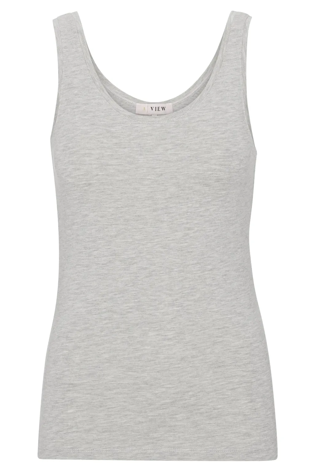 Lysegrå tanktop fra A-View med rund halsudskæring og brede stropper. Den melerede top har en tætsiddende pasform og er lavet af et elastisk materiale med god stræk.