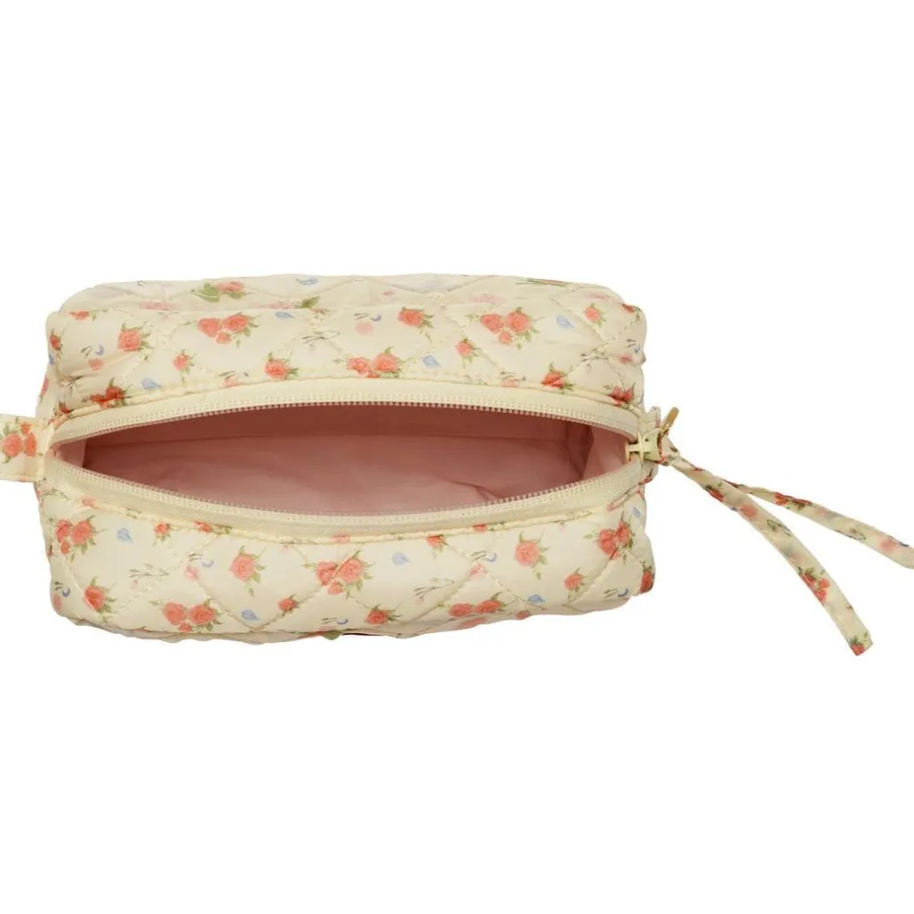 Quiltet kosmetiktaske fra Maanesten med print af roser og muslingeskaller på cremefarvet bund. Tasken har et quiltet design med blomstermønster i pink og blå nuancer.